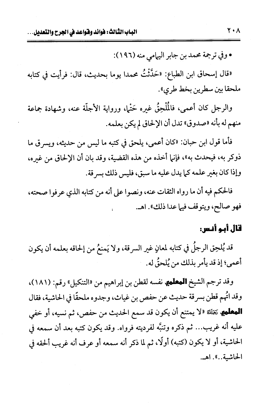 وقد ترجم الشيخ المعلمي نفسه لقطن بن إبراهيم من "التنكيل" رقم: (181)، وقد اتُهم قطن بسرقة حديث عن حفص بن غياث، وجدوه ملحقًا في الحاشية، فقال المعلمي رحمه الله "لا يمتنع أن يكون قد سمع الحديث من حفص، ثم نسيه، أو خفي عليه أنه غريب ... ثم ذكره وتنبَّه لفرديته فرواه. وقد يكون كتبه بعد أن سمعه في الحاشية، أو لا يكون (كتبه) أولًا، ثم لما ذكر أنه سمعه أو عرف أنه غريب ألحقه في الحاشية .. ". اهـ.