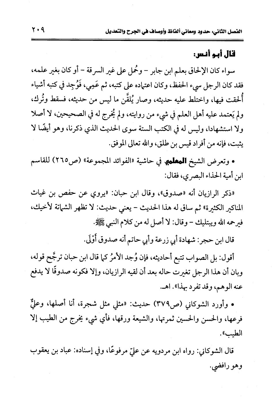 • وأورد الشوكاني (ص 379) حديث: "مثلي مثل شجرة، أنا أصلها، وعليٌّ فرعها، والحسن والحسين ثمرتها، والشيعة ورقها، فأي شيء يخرج من الطيب إلا الطيب".