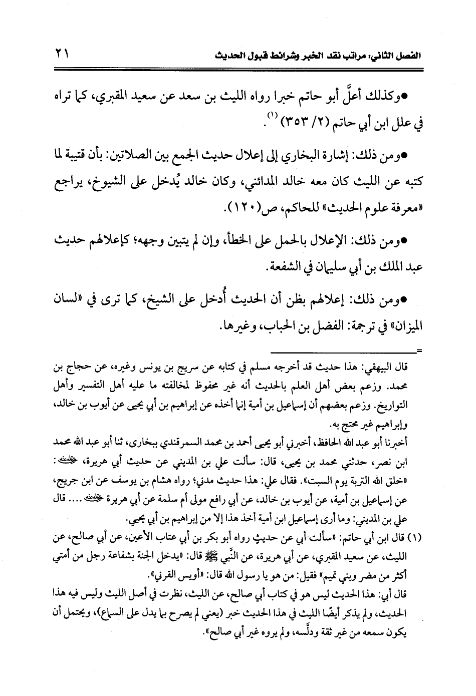 • ومن ذلك: إشارة البخاري إلى إعلال حديث الجمع بين الصلاتين: بأن قتيبة لما كتبه عن الليث كان معه خالد المدائني، وكان خالد يُدخل على الشيوخ، يراجع "معرفة علوم الحديث" للحاكم، ص (120).