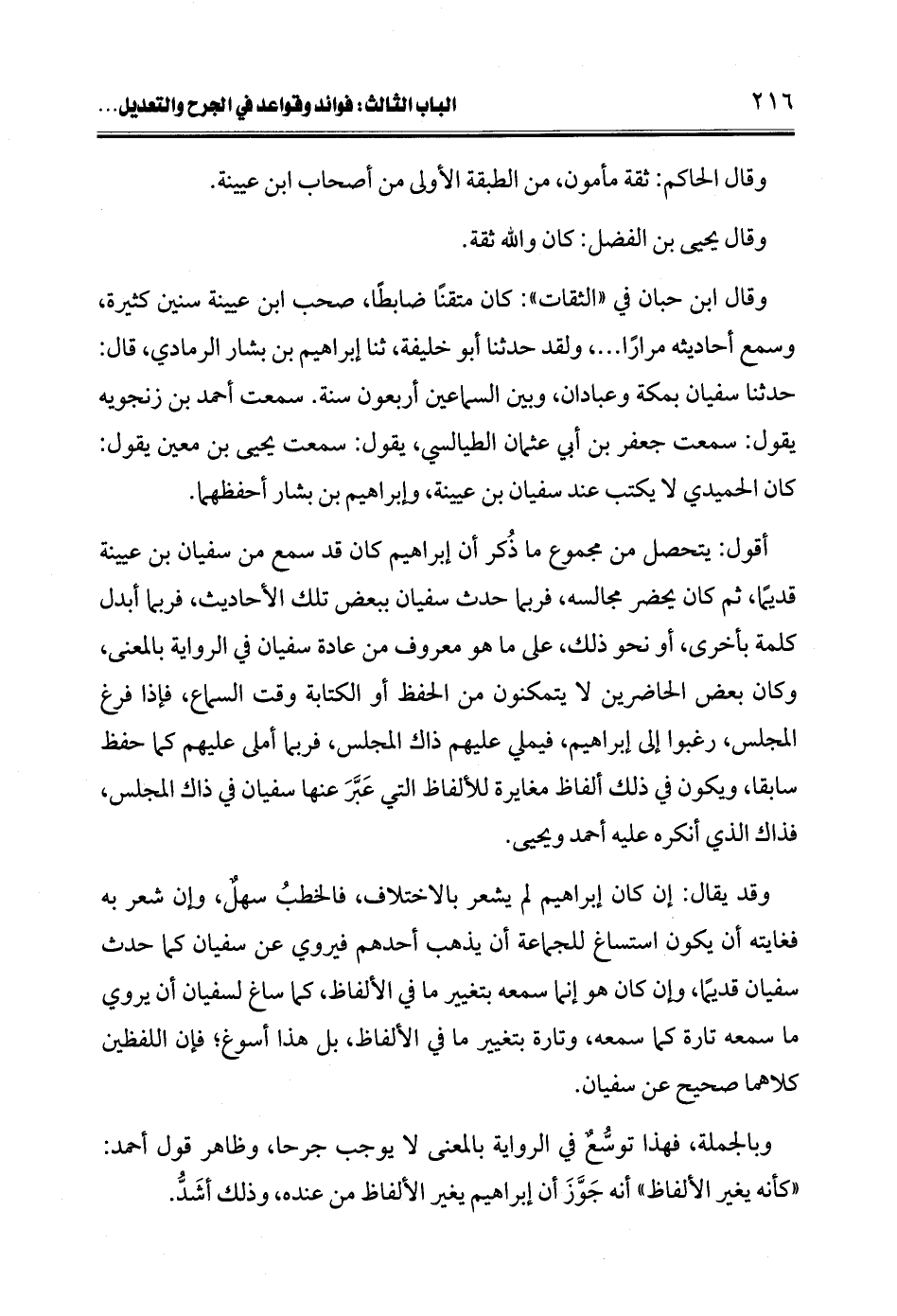 وقد يقال: إن كان إبراهيم لم يشعر بالاختلاف، فالخطبُ سهلٌ، وإن شعر به فغايته أن يكون استساغ للجماعة أن يذهب أحدهم فيروي عن سفيان كما حدث سفيان قديمًا، وإن كان هو إنما سمعه بتغيير ما في الألفاظ، كما ساغ لسفيان أن يروي ما سمعه تارة كما سمعه، وتارة بتغيير ما في الألفاظ، بل هذا أسوغ؛ فإن اللفظين كلاهما صحيح عن سفيان.