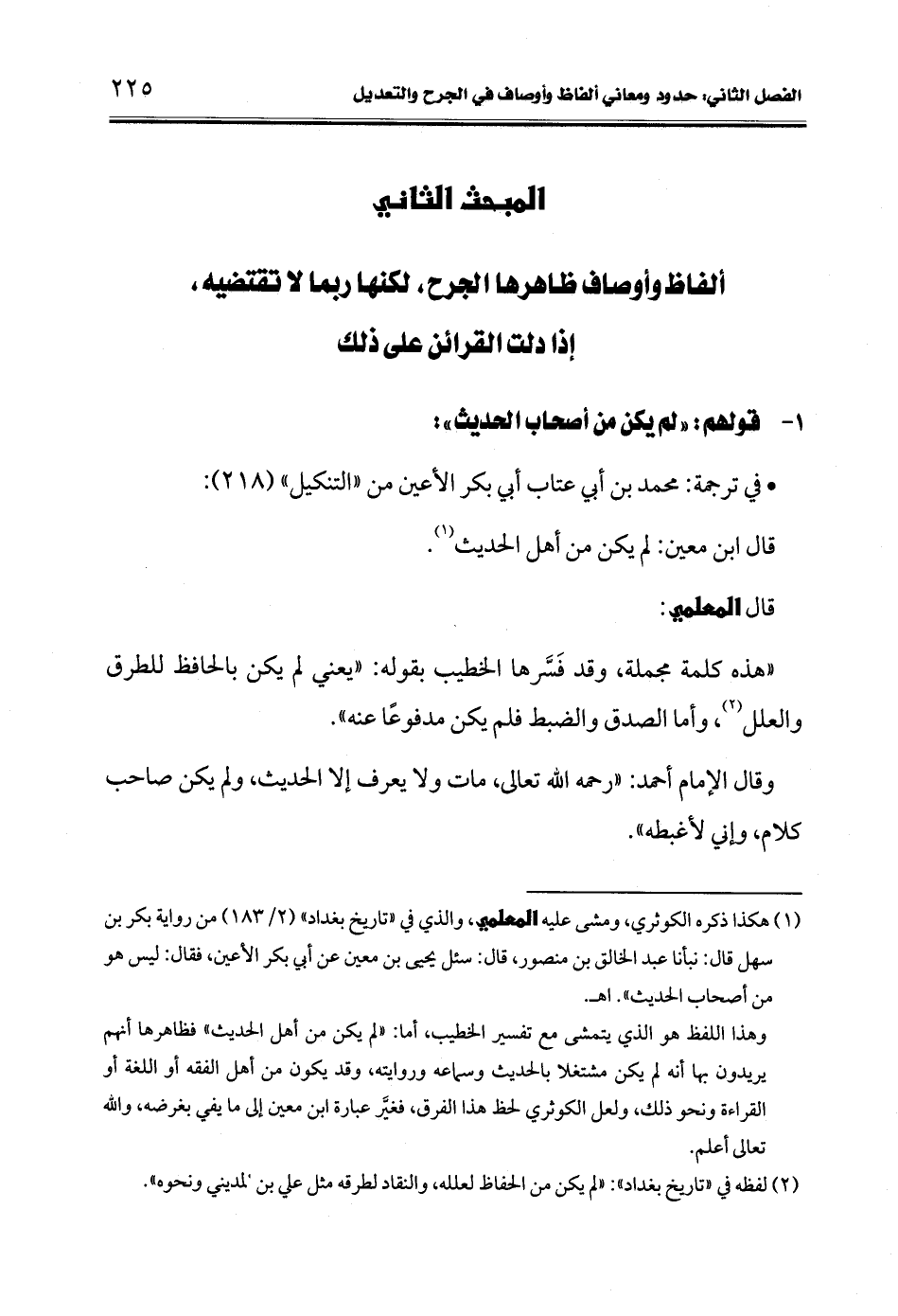 وهذا اللفظ هو الذي يتمشى مع تفسير الخطيب، أما: "لم يكن من أهل الحديث" فظاهرها أنهم يريدون جمها أنه لم يكن مشتغلا بالحديث وسماعه وروايته، وقد يكون من أهل الفقه أو اللغة أو القراءة ونحو ذلك، ولعل الكوثري لحظ هذا الفرق، فغيَّر عبارة ابن معين إلى ما يفي بغرضه، والله تعالى أعلم.