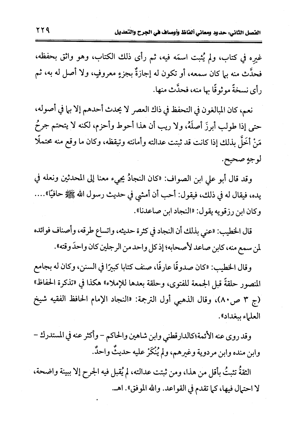 وقد قال أبو علي ابن الصواف: "كان النجادُ يجيء معنا إلى المحدثين ونعله في يده، فيقال له في ذلك، فيقول: أحب أن أمشي في حديث رسول الله -صلى الله عليه وسلم- حافيًا" .... وكان ابن رزقويه يقول: "النجاد ابن صاعدنا".