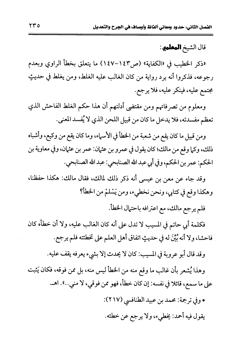 "ذكر الخطيب في "الكفاية" (ص 143 - 147) ما يتعلق بخطأ الراوي وبعدم رجوعه، فذكروا أنه يرد رواية من كان الغالب عليه الغلط، ومن يغلط في حديثٍ مجتمع عليه، فينكر عليه، فلا يرجع.