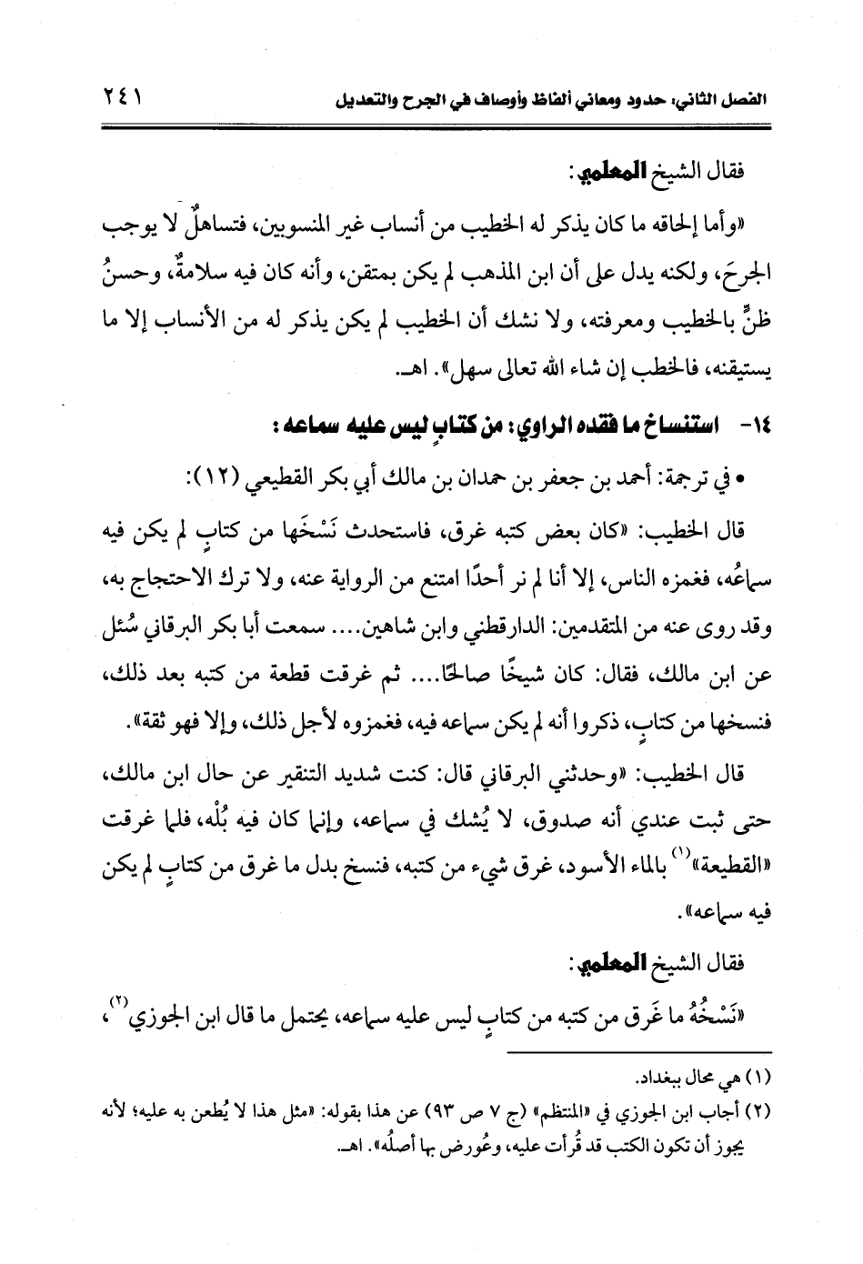 (¬2) أجاب ابن الجوزي في "المنتظم" (ج 7 ص 93) عن هذا بقوله: "مثل هذا لا يُطعن به عليه، لأنه يجوز أن تكون الكتب قد قُرأت عليه، وعُورض بها أصلُه". اهـ.