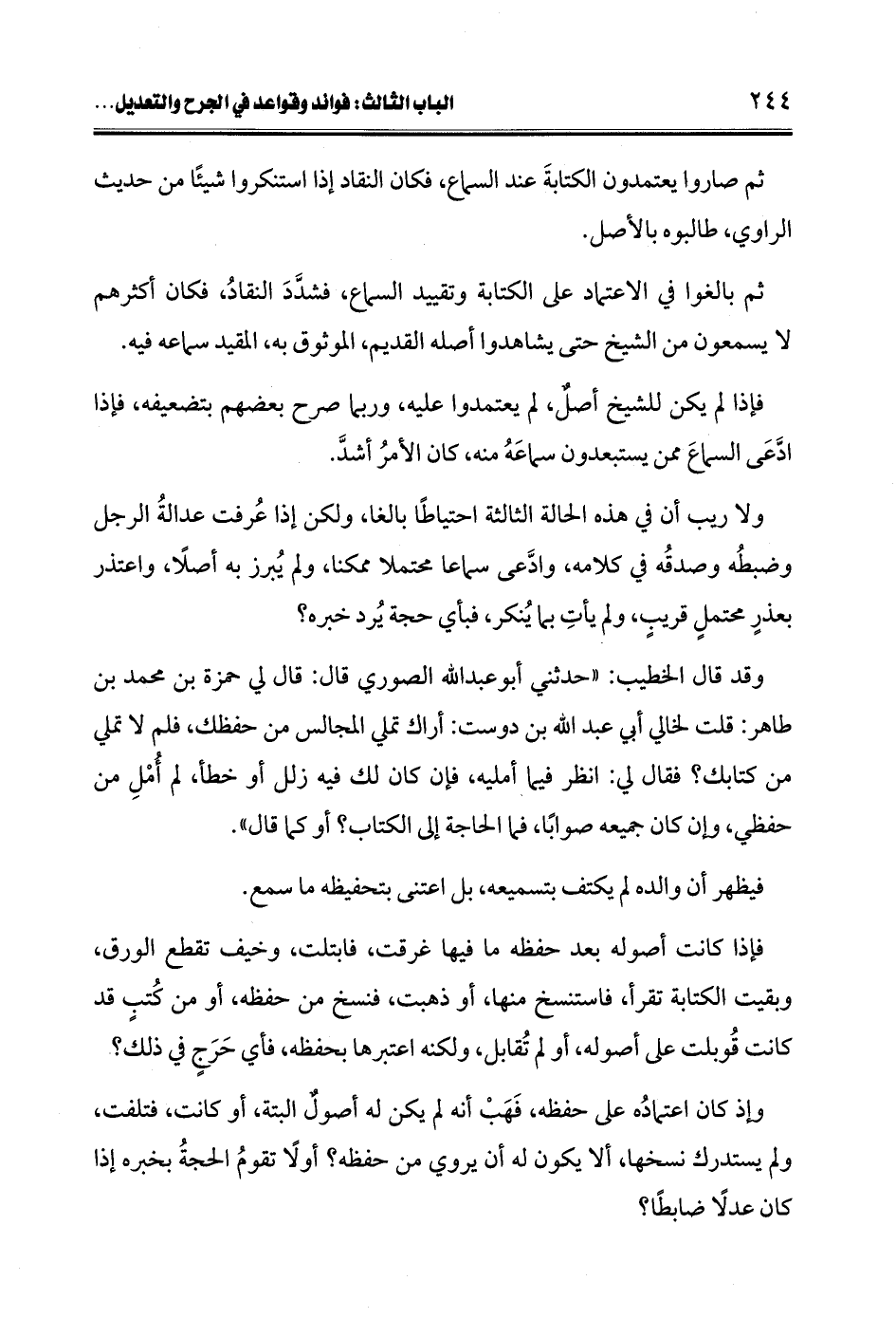 ثم بالغوا في الاعتماد على الكتابة وتقييد السماع، فشدَّدَ النقادُ، فكان أكثرهم لا يسمعون من الشيخ حتى يشاهدوا أصله القديم، الموثوق به، المقيد سماعه فيه.