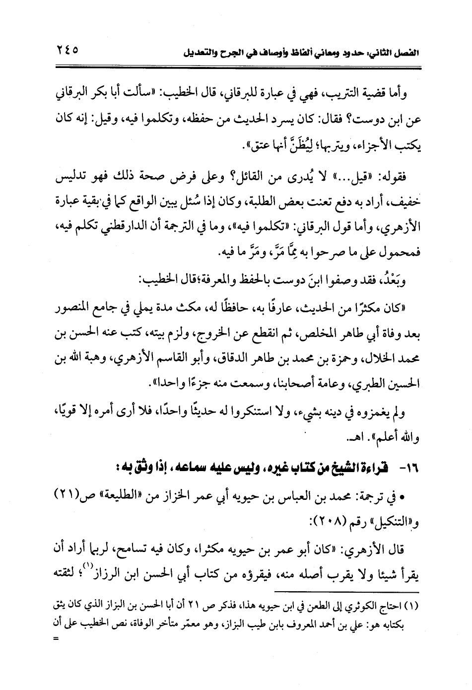 (¬1) احتاج الكوثري إلى الطعن في ابن حيويه هذا، فذكر ص 21 أن أبا الحسن بن البزاز الذي كان يثق بكتابه هو: علي بن أحمد المعروف بابن طيب البزاز، وهو معمّر متأخر الوفاة، نص الخطيب على أن =