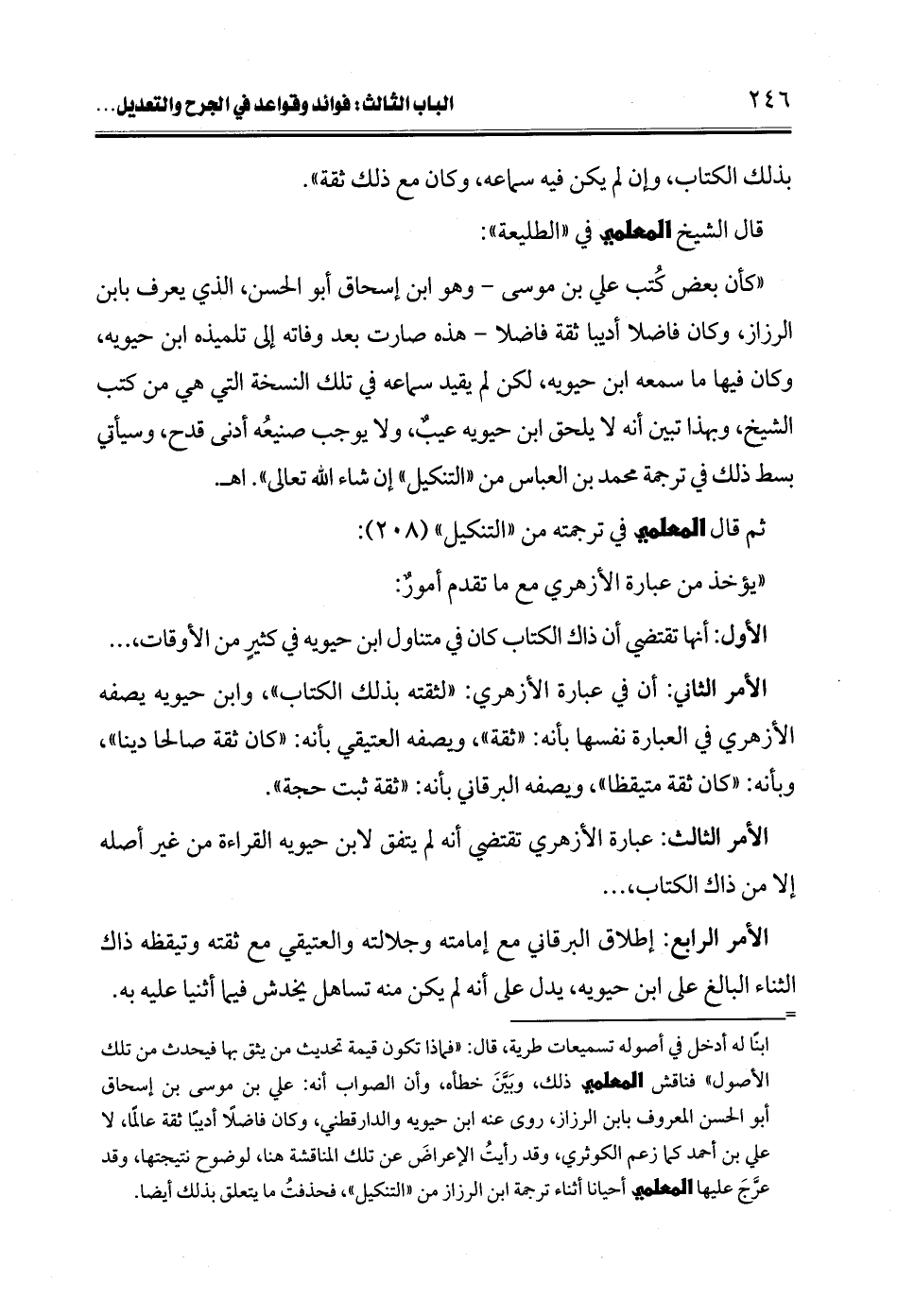= ابنًا له أدخل في أصوله تسميعات طرية، قال: "فماذا تكون قيمة تحديث من يثق بها فيحدث من تلك الأصول" فناقش المعلمي ذلك، وبَيَّنَ خطأه، وأن الصواب أنه: علي بن موسى بن إسحاق أبو الحسن المعروف بابن الرزاز، روى عنه ابن حيويه والدارقطني، وكان فاضلًا أديبًا ثقة عالمًا، لا علي بن أحمد كما زعم الكوثري، وقد رأيتُ الإعراضَ عن تلك المناقشة هنا، لوضوح نتيجتها، وقد عرَّجَ عليها المعلمي أحيانا أثناء ترجمة ابن الرزاز من "التنكيل"، فحذفُ ما يتعلق بذلك أيضًا.
