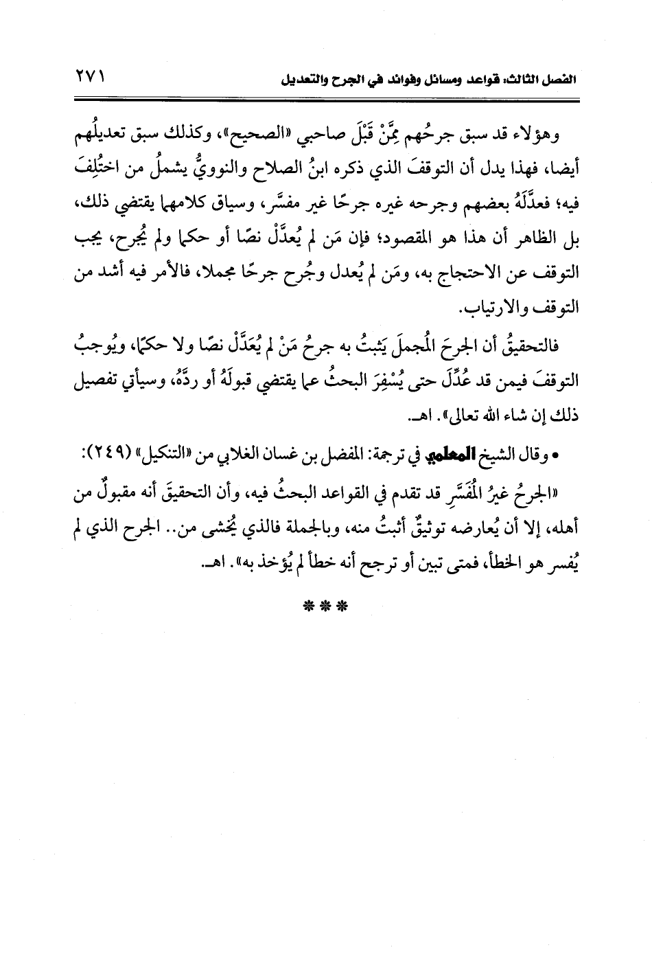 "الجرحُ غيرُ المُفَسَّرِ قد تقدم في القواعد البحثُ فيه، وأن التحقيقَ أنه مقبولٌ من أهله، إلا أن يُعارضه توثيقٌ أثبتُ منه، وبالجملة فالذي يُخشى من .. الجرح الذي لم يُفسر هو الخطأ، فمتى تبين أو ترجح أنه خطأ لم يُؤخذ به". اهـ.