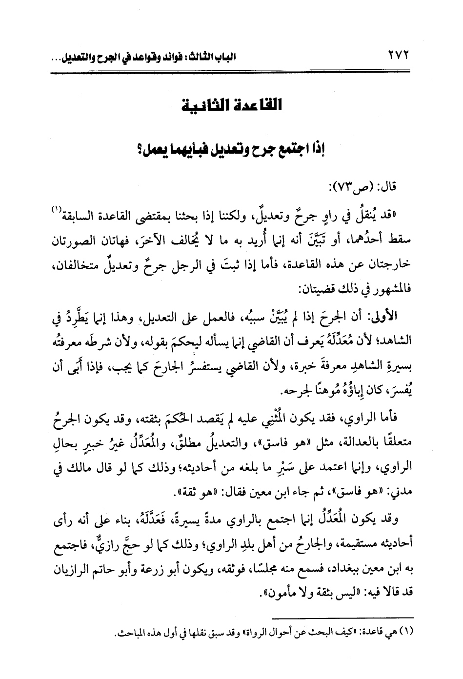 "قد يُنقلُ في راوٍ جرحٌ وتعديلٌ، ولكننا إذا بحثنا بمقتضى القاعدة السابقة (¬1) سقط أحدُهما، أو تَبَيَّنَ أنه إنما أُريد به ما لا يُخالف الآخرَ، فهاتان الصورتان خارجتان عن هذه القاعدة، فأما إذا ثبتَ في الرجل جرحٌ وتعديلٌ متخالفان، فالمشهور في ذلك قضيتان: