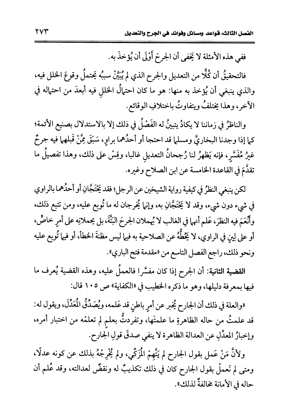 القضية الثانية: أن الجرح إذا كان مفسَّرا فالعملُ عليه، وهذه القضية يُعرف ما فيها بمعرفة دليلها، وهو ما ذكره الخطيب في "الكفاية" ص 105 قال: