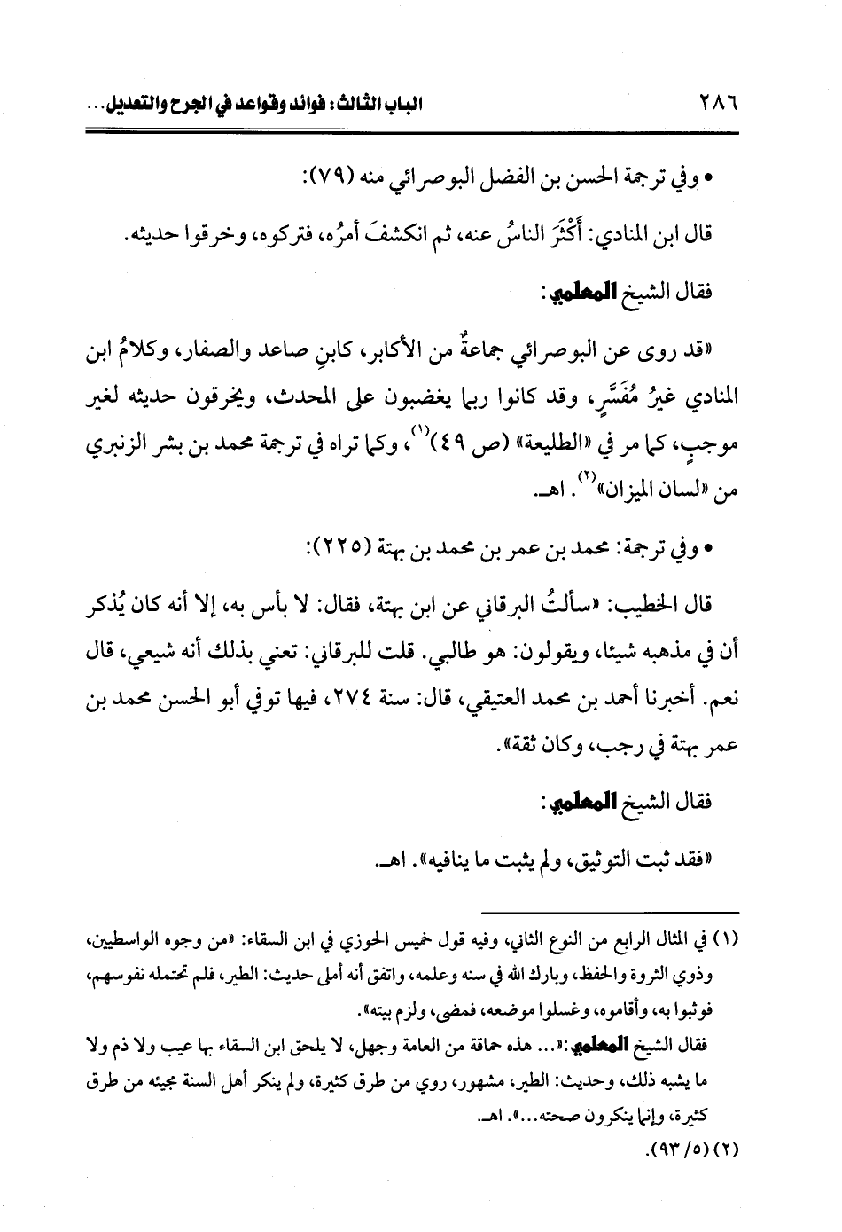 "قد روى عن البوصرائي جماعةٌ من الأكابر، كابنِ صاعد والصفار، وكلامُ ابن المنادي غيرُ مُفَسَّرٍ، وقد كانوا ربما يغضبون على المحدث، ويخرقون حديثه لغير موجبٍ، كما مر في "الطليعة" (ص 49) (¬1)، وكما تراه في ترجمة محمد بن بشر الزنبري من "لسان الميزان" (¬2). اهـ.