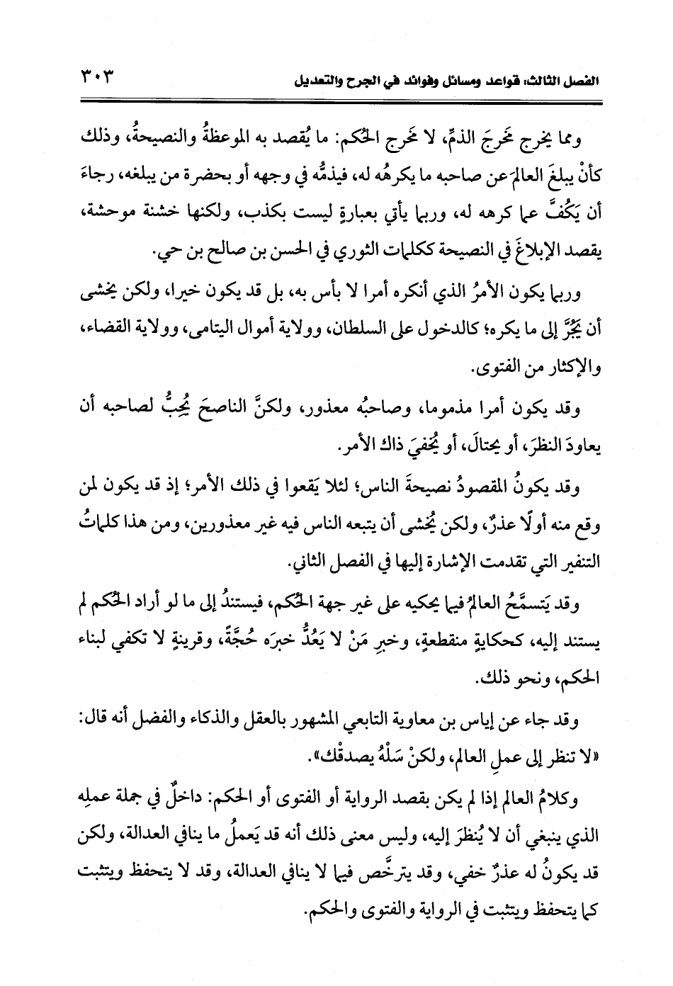 ومما يخرج مَخرجَ الذمِّ، لا مخَرج الحُكم: ما يُقصد به الموعظةُ والنصيحةُ، وذلك كأنْ يبلغَ العالمَ عن صاحبه ما يكرهُه له، فيذمُّه في وجهه أو بحضرة من يبلغه، رجاءَ أن يَكُفَّ عما كرهه له، وربما يأتي بعبارةٍ ليست بكذب، ولكنها خشنة موحشة، يقصد الإبلاغَ في النصيحة ككلمات الثوري في الحسن بن صالح بن حي.