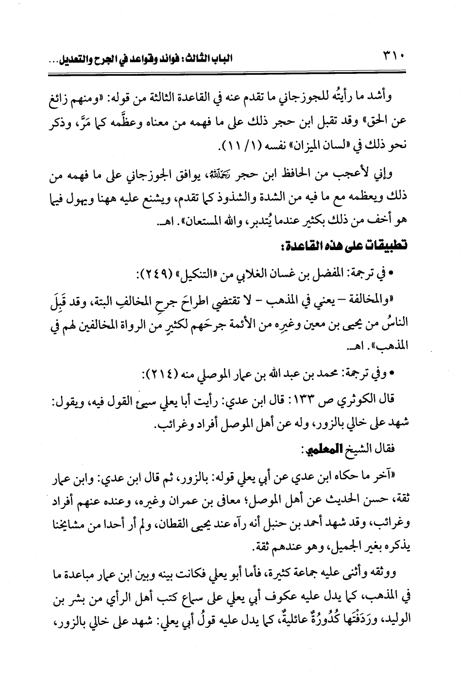 وأشد ما رأيتُه للجوزجاني ما تقدم عنه في القاعدة الثالثة من قوله: "ومنهم زائغ عن الحق" وقد تقبل ابن حجر ذلك على ما فهمه من معناه وعظَّمه كما مَرَّ، وذكر نحو ذلك في "لسان الميزان" نفسه (1/ 11).