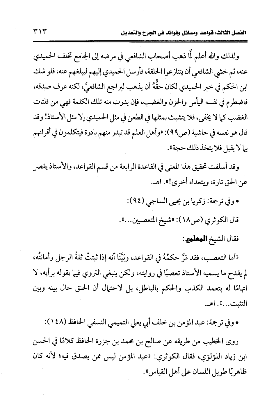 ولذلك والله أعلم لما ذهب أصحاب الشافعي في مرضه إلى الجامع تخلف الحميدي عنه، ثم خشي الشافعي أن يتنازعوا الحلقة، فأرسل الحميدي إليهم ليبلغهم عنه، فلو شك ابن الحكم في خبر الحميدي لكان حقُّهُ أن يذهب ليراجع الشافعيَّ، لكنه عرف صدقه، فاضطرم في نفسه اليأس والحزن والغضب، فإن بدرت منه تلك الكلمة فهي من فلتات الغضب كما لا يخفى، فلا يتشبث بمثلها في الطعن في مثل الحميدي إلا مثل الأستاذ! وقد قال هو نفسه في حاشية (ص 99): "وأهل العلم قد تبدر منهم بادرة فيتكلمون في أقرانهم بما لا يقبل فلا يتخذ ذلك حجة".