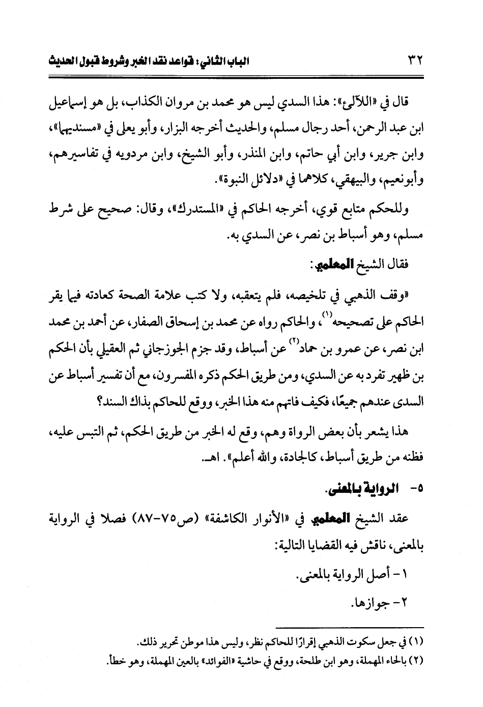 عقد الشيخ المعلمي في "الأنوار الكاشفة" (ص 75 - 87) فصلا في الرواية بالمعنى، ناقش فيه القضايا التالية: