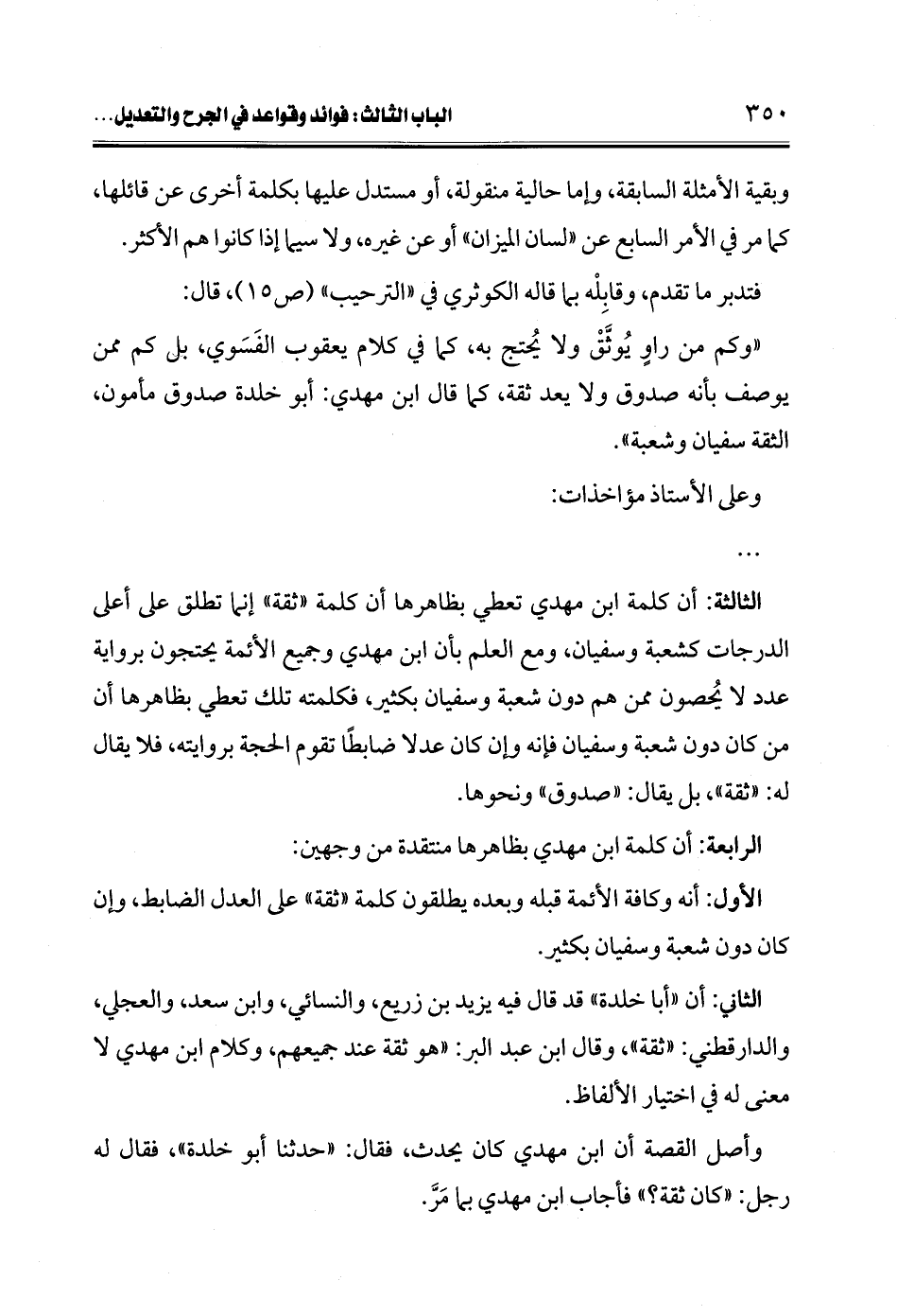الثالثة: أن كلمة ابن مهدي تعطي بظاهرها أن كلمة "ثقة" إنما تطلق على أعلى الدرجات كشعبة وسفيان، ومع العلم بأن ابن مهدي وجميع الأئمة يحتجون برواية عدد لا يُحصون ممن هم دون شعبة وسفيان بكثير، فكلمته تلك تعطي بظاهرها أن من كان دون شعبة وسفيان فإنه وإن كان عدلا ضابطًا تقوم الحجة بروايته، فلا يقال له: "ثقة"، بل يقال: "صدوق" ونحوها.