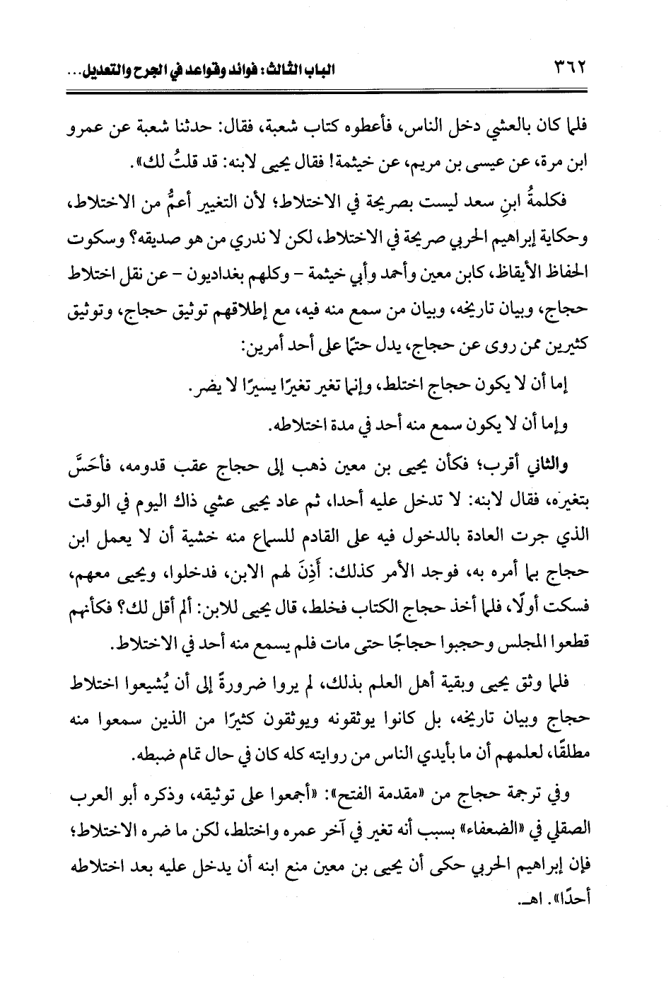 فلما وثق يحيى وبقية أهل العلم بذلك، لم يروا ضرورةً إلى أن يُشيعوا اختلاط حجاج وبيان تاريخه، بل كانوا يوثقونه ويوثقون كثيرًا من الذين سمعوا منه مطلقًا، لعلمهم أن ما بأيدي الناس من روايته كله كان في حال تمام ضبطه.