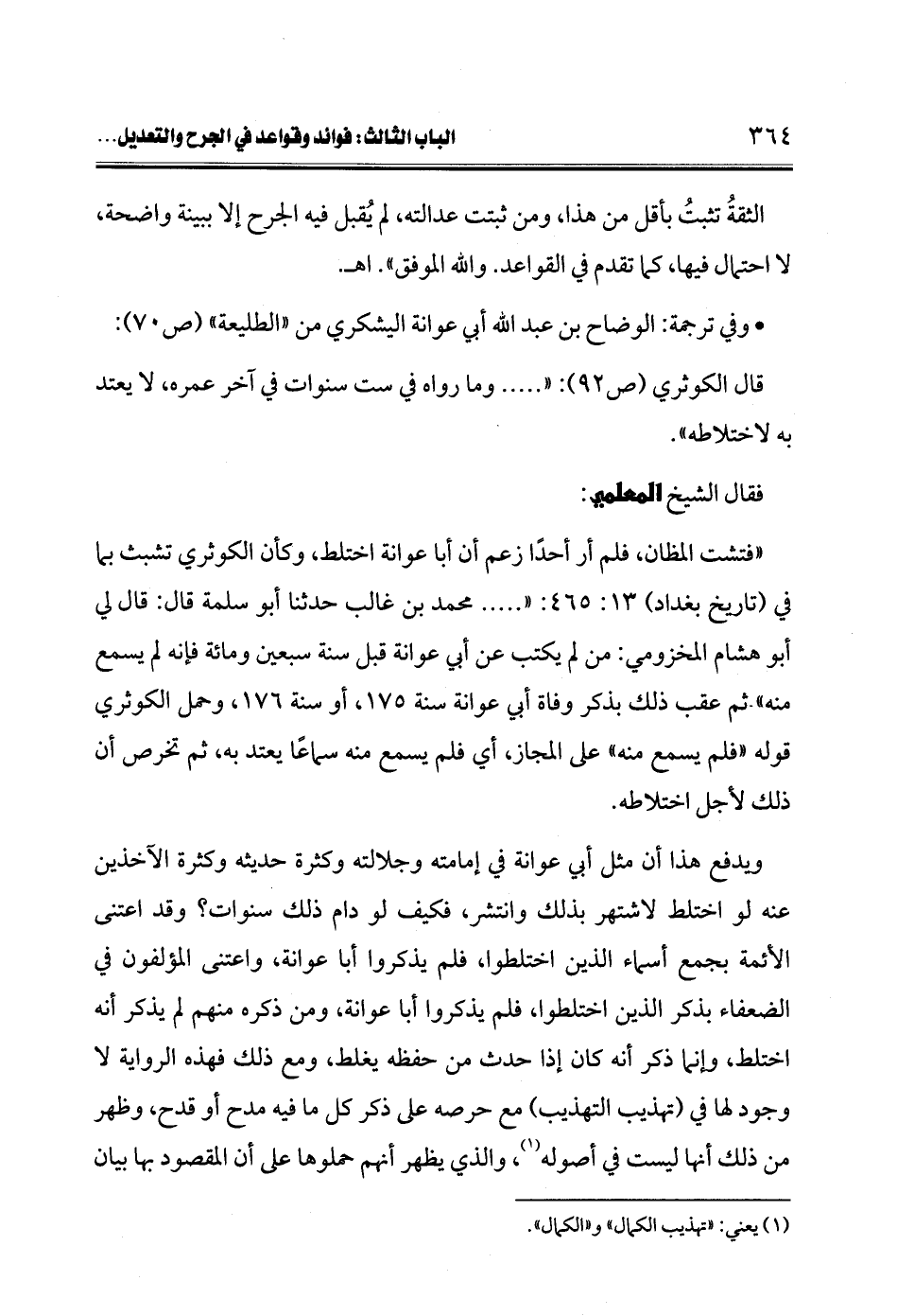"فتشت المظان، فلم أر أحدًا زعم أن أبا عوانة اختلط، وكأن الكوثري تشبث بما في (تاريخ بغداد) 13: 465: " ... محمد بن غالب حدثنا أبو سلمة قال: قال لي أبو هشام المخزومي: من لم يكتب عن أبي عوانة قيل سنة سبعين ومائة فإنه لم يسمع منه" ثم عقب ذلك بذكر وفاة أبي عوانة سنة 175، أو سنة 176، وحمل الكوثري قوله "فلم يسمع منه" على المجاز، أي فلم يسمع منه سماعًا يعتد به، ثم تخرص أن ذلك لأجل اختلاطه.