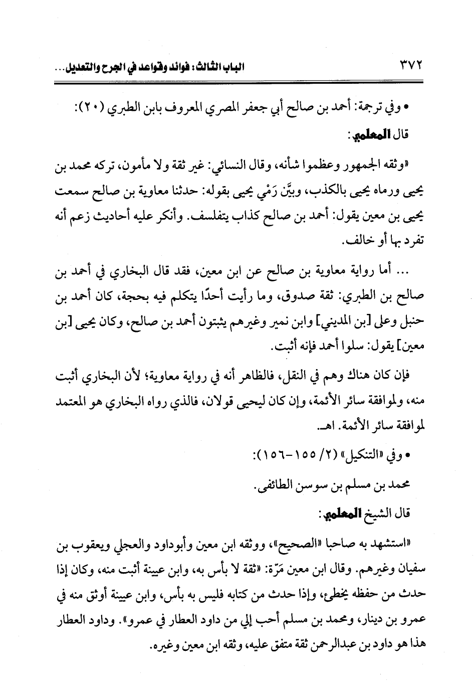 ... أما رواية معاوية بن صالح عن ابن معين، فقد قال البخاري في أحمد بن صالح بن الطبري: ثقة صدوق، وما رأيت أحدًا يتكلم فيه بحجة، كان أحمد بن حنبل وعلي [بن المديني] وابن نمير وغيرهم يثبتون أحمد بن صالح، وكان يحيى [بن معين] يقول: سلوا أحمد فإنه أثبت.
