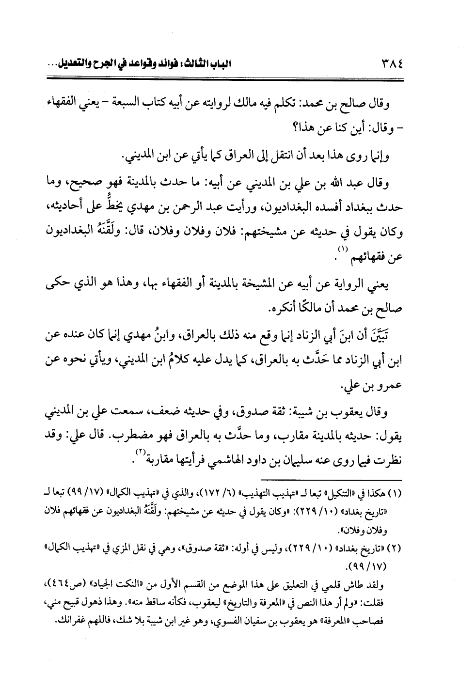 (¬1) هكذا في "التنكيل" تبعا لـ"تهذيب التهذيب" (6/ 172)، والذي في "تهذيب الكمال" (17/ 99) تبعا لـ "تاريخ بغداد" (10/ 229): "وكان يقول في حديثه عن مشيختهم: ولَقَّنَه البغداديون عن فقهائهم فلان وفلان وفلان".
