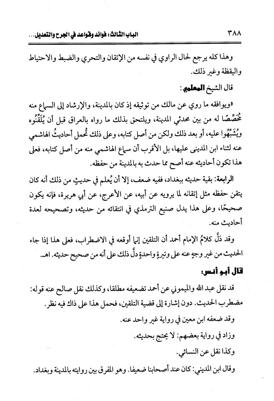 "ويوافقه ما روي عن مالك من توثيقه إذ كان بالمدينة، والإرشاد إلى السماع منه مُخَصِّصًا له من بين محدثي المدينة، ويلتحق بذلك ما رواه بالعراق قيل أن يُلَقِّنُوه ويُشَبِّهُوا عليه، أو بعد ذلك ولكن من أصل كتابه, وعلى ذلك تُحمل أحاديثُ الهاشمي عنه لثناء ابن المدينى عليها، بل الأقرب أن سماع الهاشمي منه من أصل كتابه, فعلى هذا تكون أحاديثه عنه أصح مما حدث به بالمدينة من حفظه.
