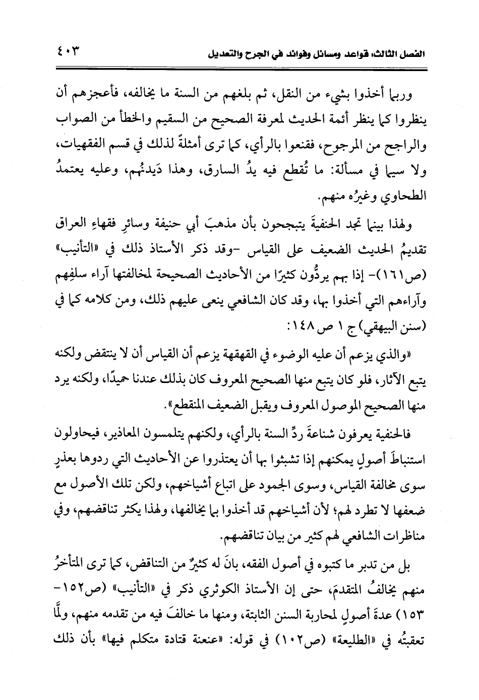 ولهذا بينما تجد الحنفيةَ يتبجحون بأن مذهبَ أبي حنيفة وسائرِ فقهاءِ العراق تقديمُ الحديث الضعيف على القياس -وقد ذكر الأستاذ ذلك في "التأنيب" (ص 161) - إذا بهم يردُّون كثيرًا من الأحاديث الصحيحة لمخالفتها آراء سلفِهم وآراءهم التي أخذوا بها، وقد كان الشافعي ينعى عليهم ذلك، ومن كلامه كما في (سنن البيهقي) ج 1 ص 148:
