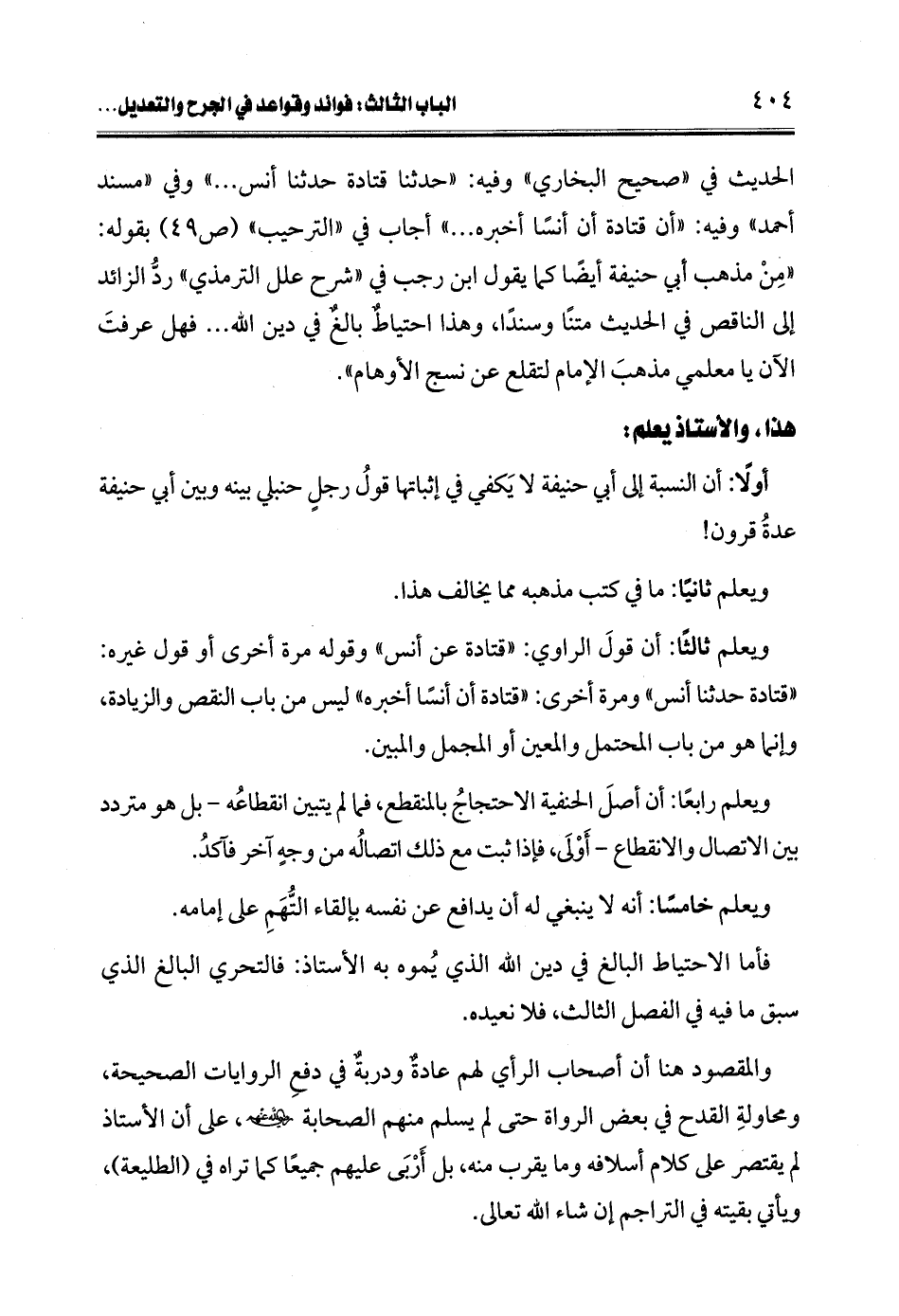 والمقصود هنا أن أصحاب الرأي لهم عادةٌ ودربةٌ في دفعِ الروايات الصحيحة، ومحاولةِ القدح في بعض الرواة حتى لم يسلم منهم الصحابة -رضي الله عنهم-، على أن الأستاذ لم يقتصر على كلام أسلافه وما يقرب منه، بل أَرْبَى عليهم جميعًا كما تراه في (الطليعة)، ويأتي بقيته في التراجم إن شاء الله تعالى.