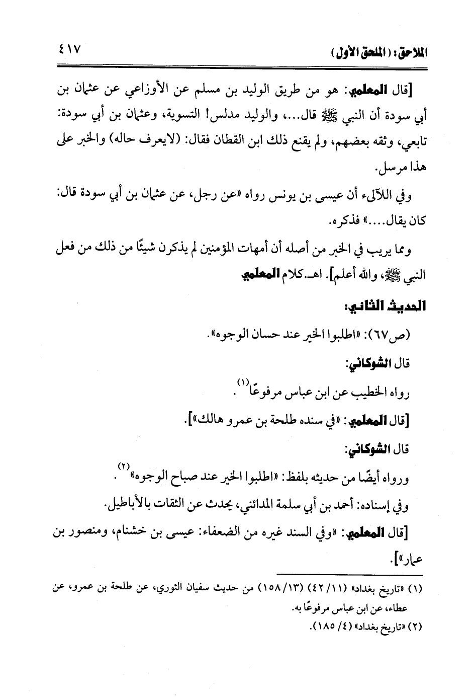 [قال المعلمي: هو من طريق الوليد بن مسلم عن الأوزاعي عن عثمان بن أبي سودة أن النبي -صلى الله عليه وسلم- قال ... ، والوليد مدلس! التسوية، وعثمان بن أبي سودة: تابعي، وثقه بعضهم، ولم يقنع ذلك ابن القطان فقال: (لا يعرف حاله) والخبر على هذا مرسل.