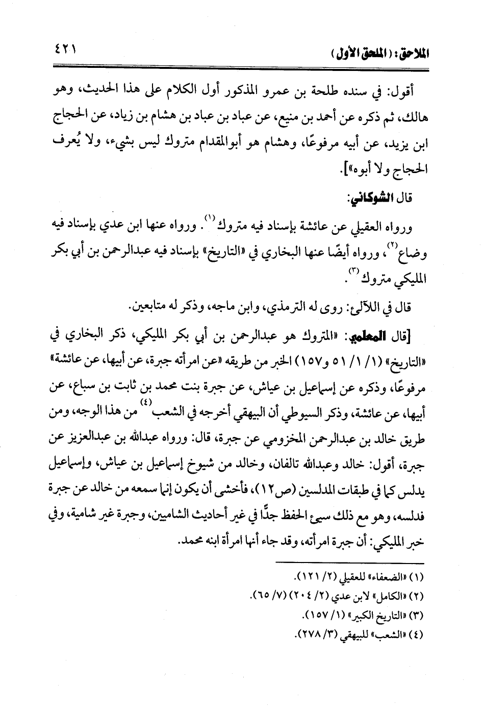 [قال المعلمي: "المتروك هو عبد الرحمن بن أبي بكر المليكي، ذكر البخاري في "التاريخ" (1/ 1 / 51 و 157) الخبر من طريقه "عن امرأته جبرة، عن أبيها، عن عائشة" مرفوعًا، وذكره عن إسماعيل بن عياش، عن جبرة بنت محمد بن ثابت بن سباع، عن أبيها، عن عائشة, وذكر السيوطي أن البيهقي أخرجه في الشعب (¬4) من هذا الوجه، ومن طريق خالد بن عبد الرحمن المخزومي عن جبرة, قال: ورواه عبد الله بن عبد العزيز عن جبرة، أقول: خالد وعبد الله تالفان، وخالد من شيوخ إسماعيل بن عياش، وإسماعيل يدلس كما في طبقات المدلسين (ص 12)، فأخشى أن يكون إنما سمعه من خالد عن جبرة فدلسه، وهو مع ذلك سيء الحفظ جدًّا في غير أحاديث الشاميين وجبرة غير شامية، وفي خبر المليكي: أن جبرة امرأته، وقد جاء أنها امرأة ابنه محمد.