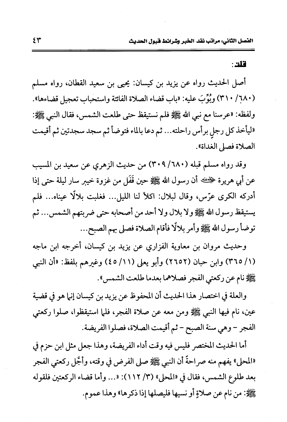 والعلة في اختصار هذا الحديث أن المحفوظ عن يزيد بن كيسان إنما هو في قضية عين، نام فيها النبي -صلى الله عليه وسلم- ومن معه عن صلاة الفجر، فلما استيقظوا، صلوا ركعتي الفجر -وهي سنة الصبح- ثم أقيمت الصلاة، فصلوا الفريضة.