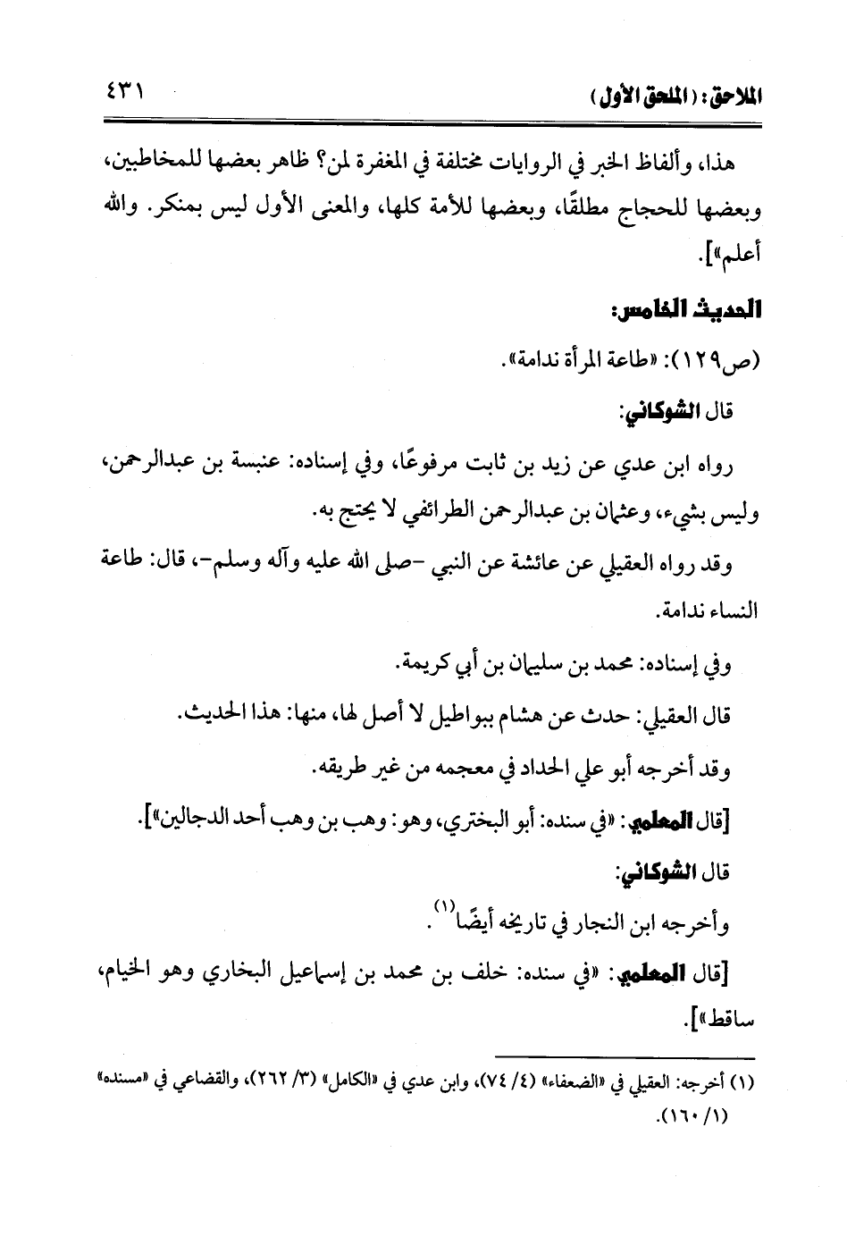 وقد رواه العقيلي عن عائشة عن النبي -صلى الله عليه وآله وسلم-، قال: طاعة النساء ندامة.