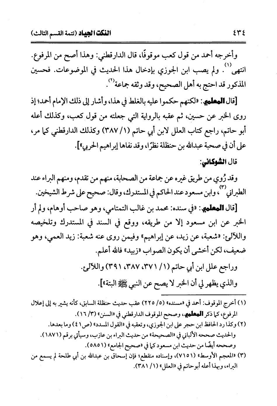 [قال المعلمي: "لكنهم حكموا عليه بالغلط في هذا، وأشار إلى ذلك الإمام أحمد؛ إذ روى الخبر عن حسين، ثم عقبه بالرواية التي جعلته من قول كعب، وكذلك أعله أبو حاتم، راجع كتاب العلل لابن أبي حاتم (1/ 387) وكذلك الدارقطني كما مر، على أن في صحبة عبد الله بن حنظلة نظرًا، وقد نفاها إبراهيم الحربي"].