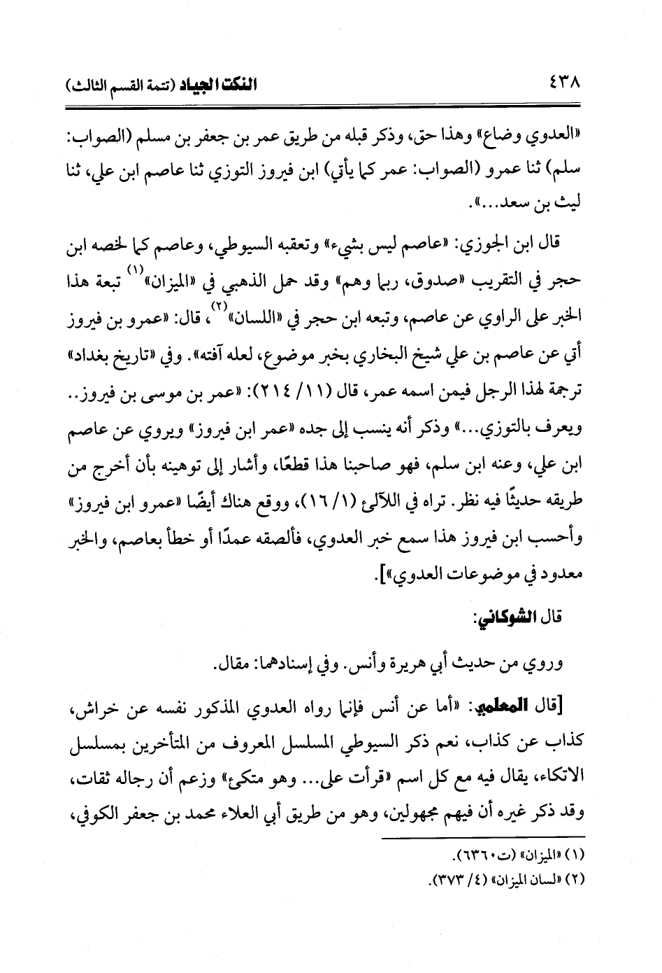 قال ابن الجوزي: "عاصم ليس بشيء" وتعقبه السيوطي، وعاصم كما لخصه ابن حجر في التقريب "صدوق، ربما وهم" وقد حمل الذهبي في "الميزان" (¬1) تبعة هذا الخبر على الراوي عن عاصم، وتبعه ابن حجر في "اللسان" (¬2)، قال: "عمرو بن فيروز أتي عن عاصم بن علي شيخ البخاري بخبر موضوع، لعله آفته". وفي "تاريخ بغداد" ترجمة لهذا الرجل فيمن اسمه عمر، قال (11/ 214): "عمر بن موسى بن فيروز .. ويعرف بالتوزي ... " وذكر أنه ينسب إلى جده "عمر ابن فيروز" ويروي عن عاصم ابن علي، وعنه ابن سلم، فهو صاحبنا هذا قطعًا، وأشار إلى توهينه بأن أخرج من طريقه حديثًا فيه نظر. تراه في اللآلىء (1/ 16)، ووقع هناك أيضًا "عمرو ابن فيروز" وأحسب ابن فيروز هذا سمع خبر العدوي، فألصقه عمدًا أو خطأ بعاصم، والخبر معدود في موضوعات العدوي"].