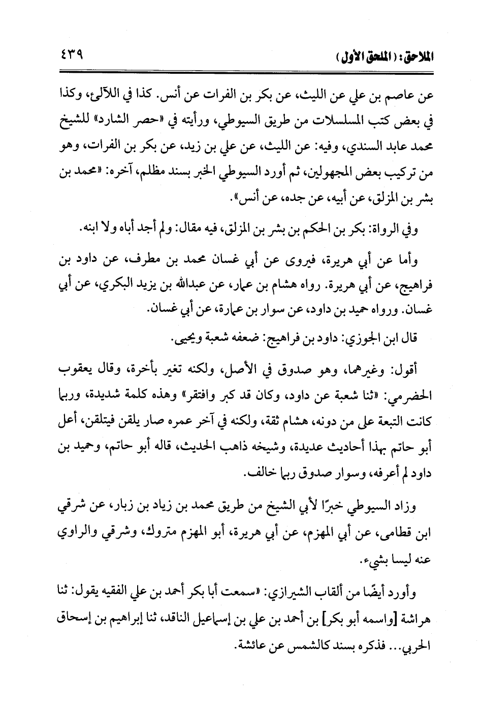عن عاصم بن علي عن الليث، عن بكر بن الفرات عن أنس. كذا في اللآلىء، وكذا في بعض كتب المسلسلات من طريق السيوطي، ورأيته في "حصر الشارد" للشيخ محمد عابد السندي، وفيه: عن الليث، عن علي بن زيد، عن بكر بن الفرات، وهو من تركيب بعض المجهولين، ثم أورد السيوطي الخبر بسند مظلم، آخره: "محمد بن بشر بن المزلق، عن أبيه، عن جده، عن أنس".