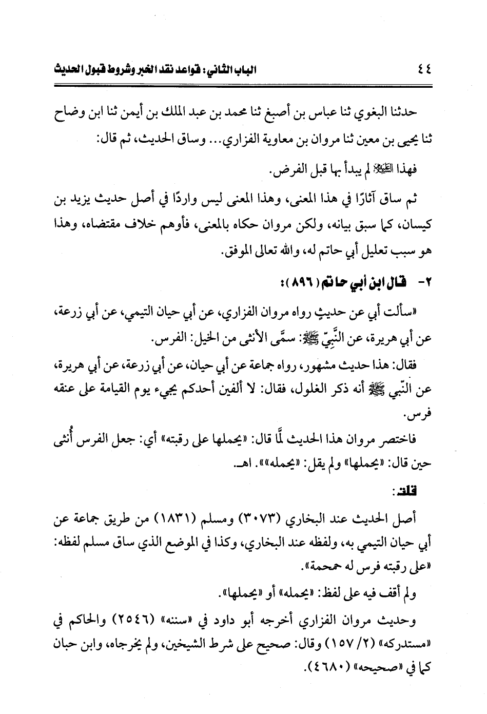 "سألت أبي عن حديثٍ رواه مروان الفزاري، عن أبي حيان التيمي، عن أبي زرعة، عن أبي هريرة عن النبي -صلى الله عليه وسلم-: سمَّى الأنثى من الخيل: الفرس.