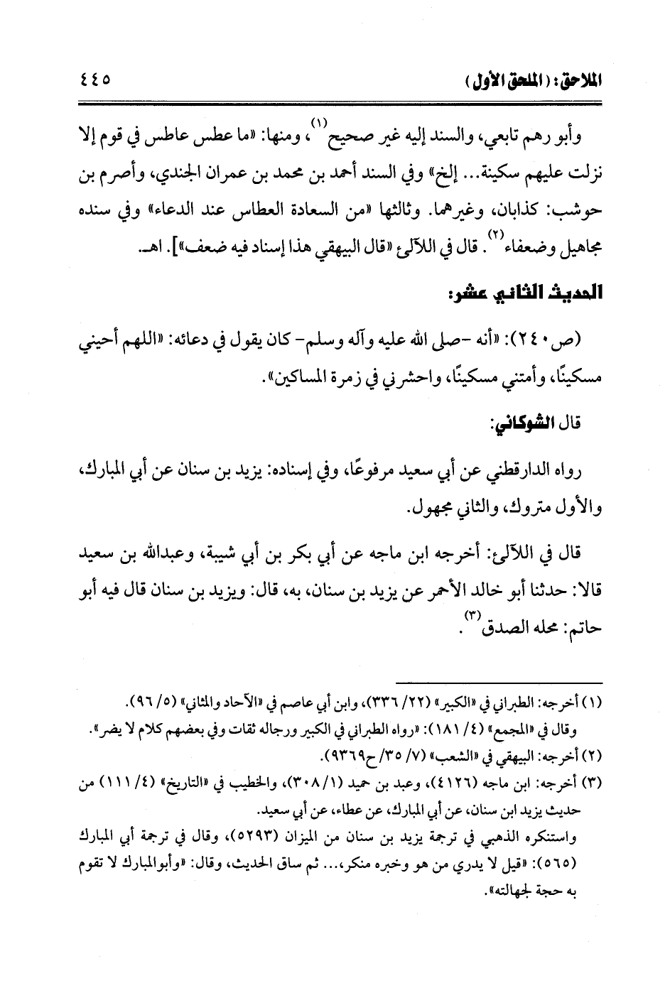 (ص 240): "أنه -صلى الله عليه وآله وسلم- كان يقول في دعائه: "اللهم أحيني مسكينًا، وأمتني مسكينًا، واحشرني في زمرة المساكين".