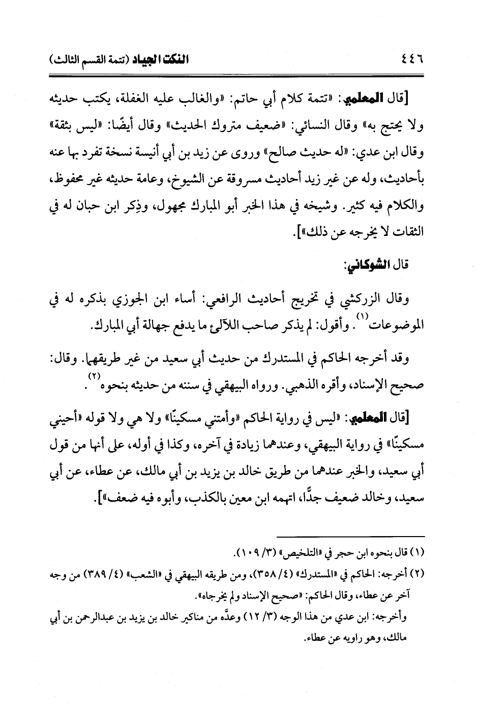 [قال المعلمي: "ليس في رواية الحاكم "وأمتني مسكينًا" ولا هي ولا قوله "أحيني مسكينًا" في رواية البيهقي، وعندهما زيادة في آخره، وكذا في أوله، على أنها من قول أبي سعيد، والخبر عندهما من طريق خالد بن يزيد بن أبي مالك، عن عطاء، عن أبي سعيد، وخالد ضعيف جدًّا، اتهمه ابن معين بالكذب، وأبوه فيه ضعف"].