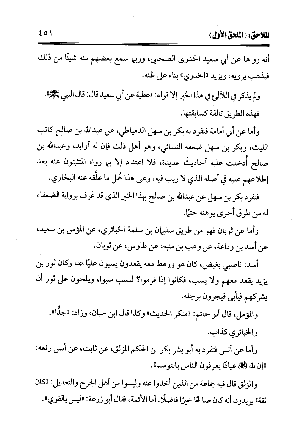 وأما عن أبي أمامة فتفرد به بكر بن سهل الدمياطي، عن عبد الله بن صالح كاتب الليث، وبكر بن سهل ضعفه النسائي، وهو أهل ذلك فإن له أوابد، وعبد الله بن صالح أُدخلت عليه أحاديثُ عديدة، فلا اعتداد إلا بما رواه المتثبتون عنه بعد إطلاعهم عليه في أصله الذي لا ريب فيه، وعلى هذا حُمل ما علَّقه عنه البخاري.