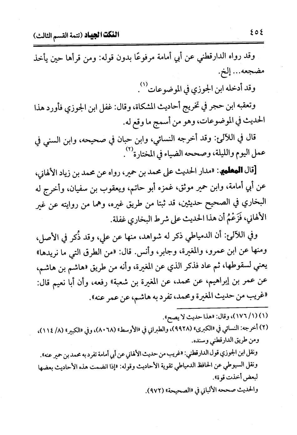 [قال الممعلمي: "مدار الحديث على محمد بن حمير، رواه عن محمد بن زياد الألهاني، عن أبي أمامة، وابن حمير موثق، غمزه أبو حاتم، ويعقوب بن سفيان، وأخرج له البخاري في الصحيح حديثين، قد ثبتًا من طريق غيره، وهما من روايته عن غير الألهاني، فَزَعْمُ أن هذا الحديث على شرط البخاري غفلة.