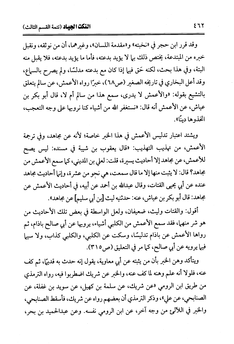 وقد قرر ابن حجر في "نخبته" و"مقدمة اللسان"، وغيرهما، أن من نوثقه، ونقبل خبره من المبتدعة، يختص ذلك بما لا يؤيد بدعته، فأما ما يؤيد بدعته، فلا يقبل منه البتة، وفي هذا بحث، لكنه حَق فيما إذا كان مع بدعته مدلسًا، ولم يصرح بالسماع، وقد أعل البخاري في تاريخه الصغير (ص 68)، خبرًا رواه الأعمش، عن سالم يتعلق بالتشيع بقوله: "والأعمش لا يدري، سمع هذا من سالم أم لا، قال أبو بكر بن عياش، عن الأعمش أنه قال: "نستغفر الله من أشياء كنا نرويها على وجه التعجب، اتخذوها دينًا".