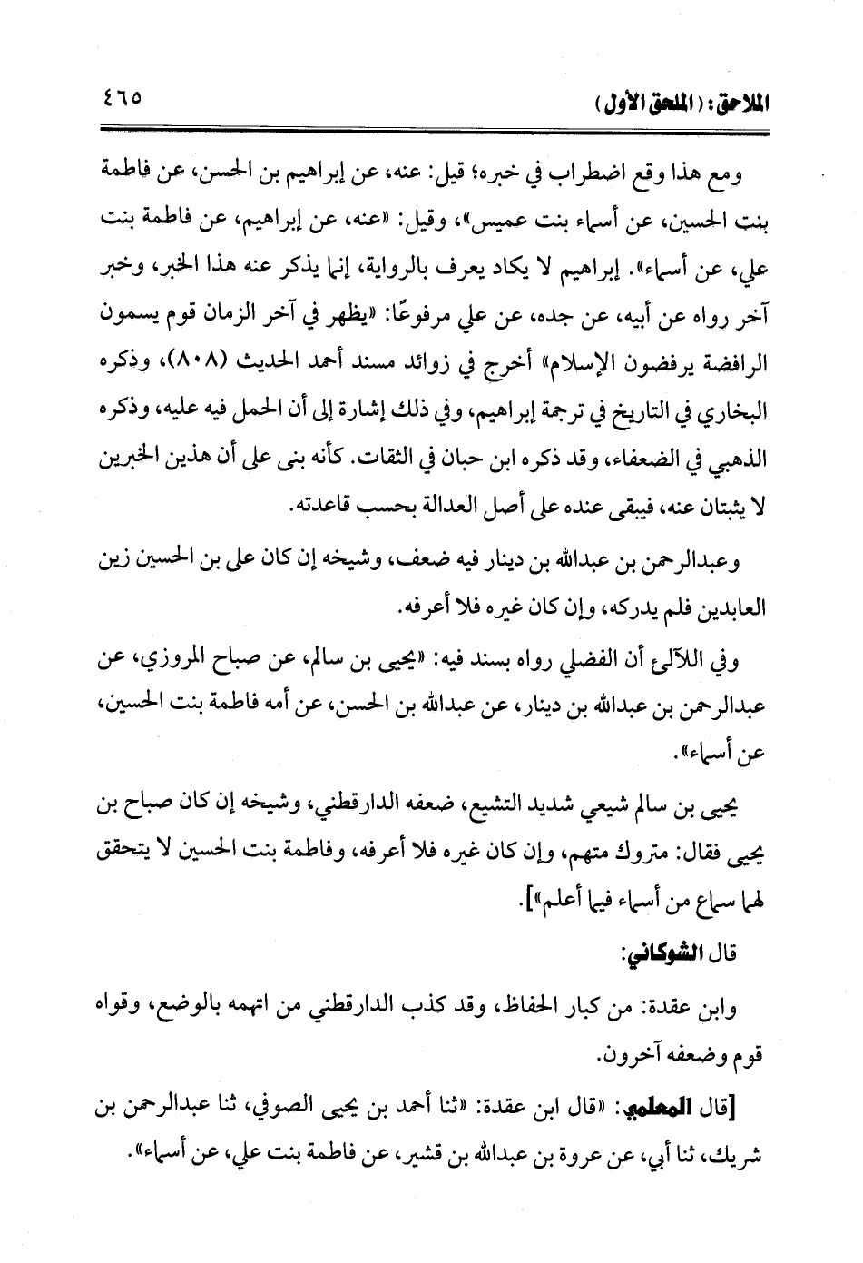[قال المعلمي: "قال ابن عقدة: "ثنا أحمد بن يحيى الصوفي، ثنا عبد الرحمن بن شريك، ثنا أبي، عن عروة بن عبد الله بن قشير، عن فاطمة بنت علي، عن أسماء".