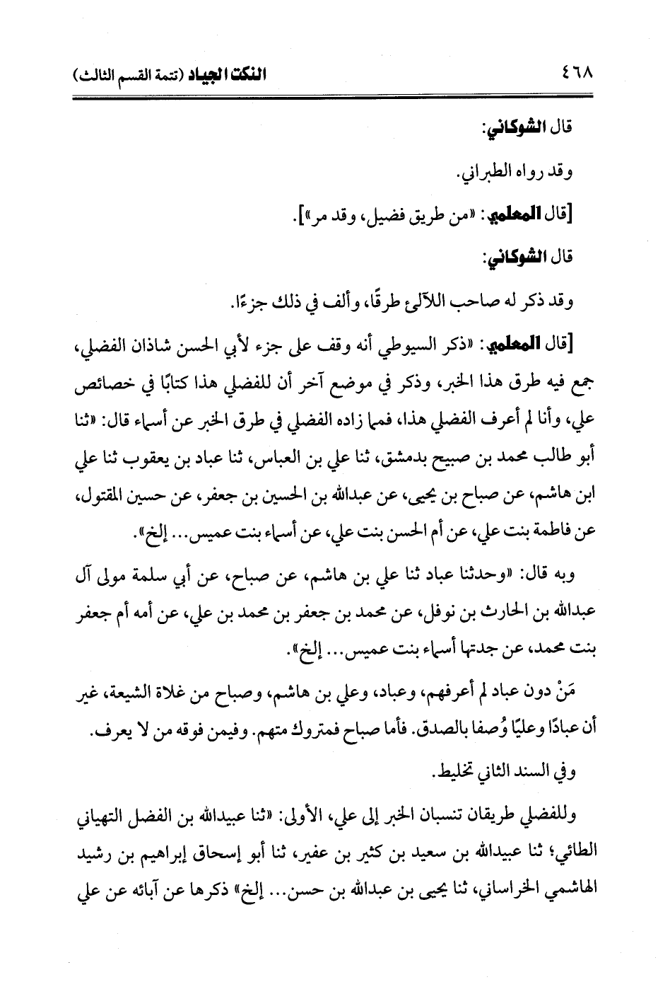[قال المعلمي: "ذكر السيوطي أنه وقف على جزء لأبي الحسن شاذان الفضلي، جمع فيه طرق هذا الخبر، وذكر في موضع آخر أن للفضلي هذا كتابًا في خصائص علي، وأنا لم أعرف الفضلي هذا، فمما زاده الفضلي في طرق الخبر عن أسماء قال: "ثنا أبو طالب محمد بن صبيح بدمشق، ثنا علي بن العباس، ثنا عباد بن يعقوب ثنا علي ابن هاشم، عن صباح بن يحيى، عن عبد الله بن الحسن بن جعفر، عن حسين المقتول، عن فاطمة بنت علي، عن أم الحسن بنت علي، عن أسماء بنت عميس ... إلخ".