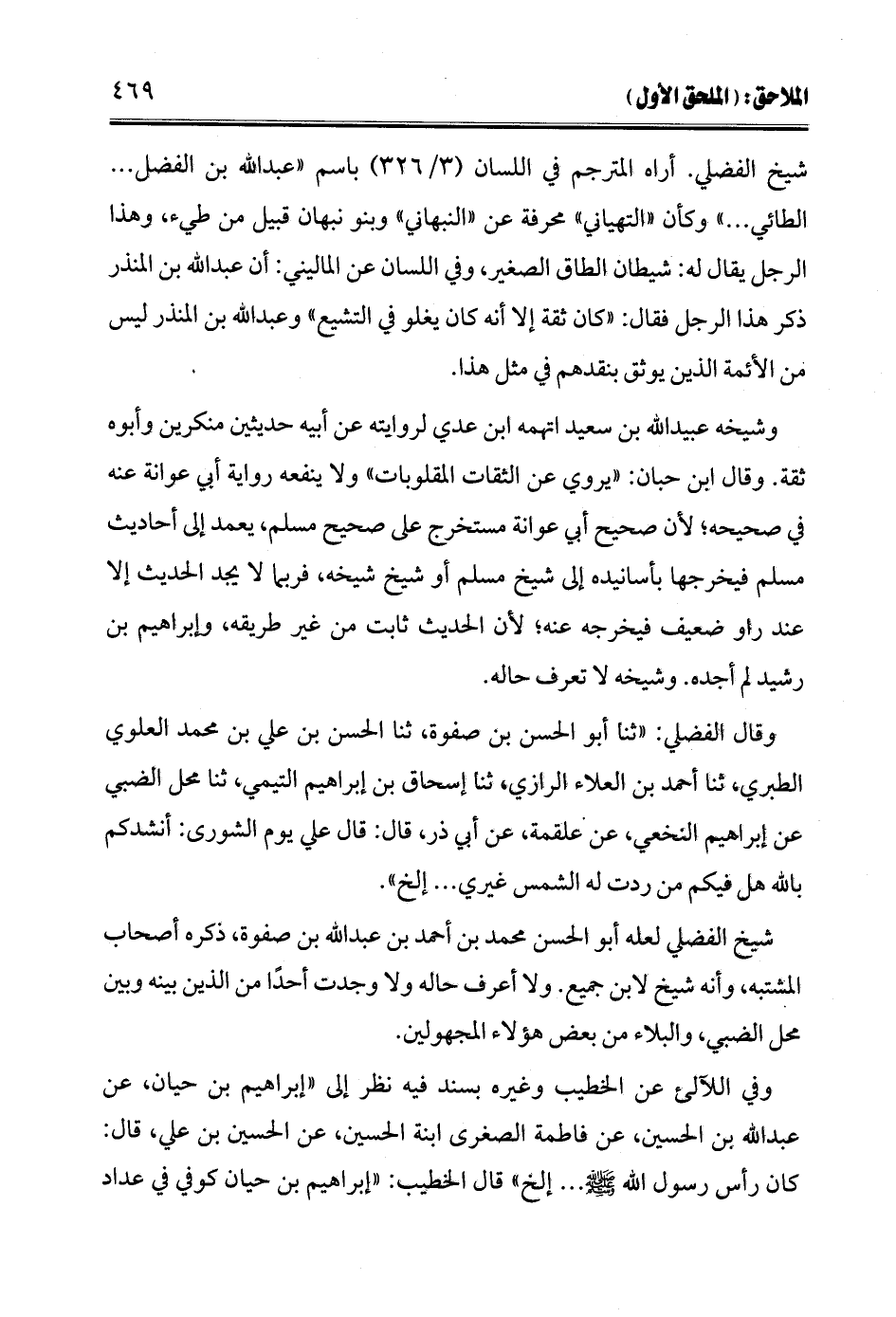 شيخ الفضلي. أراه المترجم في اللسان (3/ 326) باسم "عبد الله بن الفضل ... الطائي ... " وكأن "التهياني" محرفة عن "النبهاني" وبنو نبهان قبيل من طيء، وهذا الرجل يقال له: شيطان الطاق الصغير، وفي اللسان عن الماليني: أن عبد الله بن المنذر ذكر هذا الرجل فقال: "كان ثقة إلا أنه كان يغلو في التشيع" وعبد الله بن المنذر ليس من الأئمة الذين يوثق بنقدهم في مثل هذا.