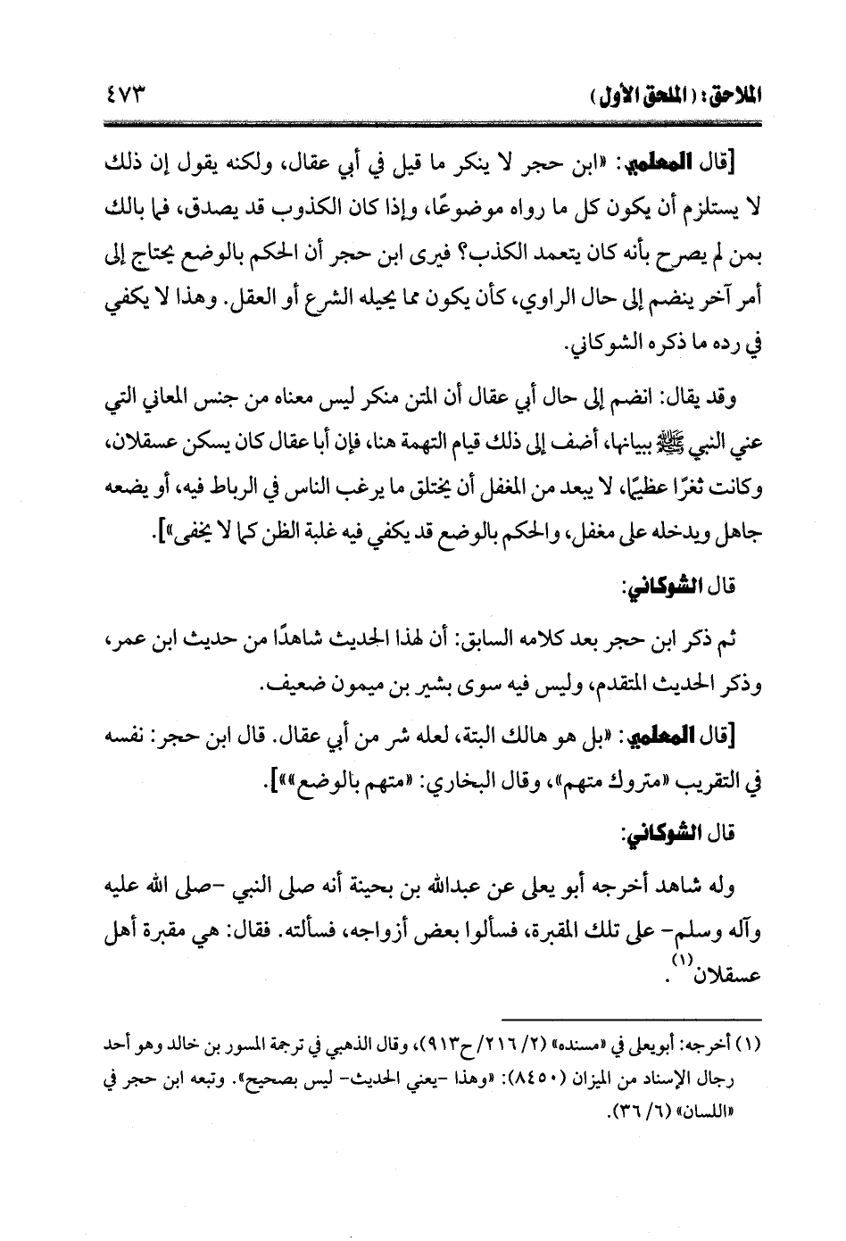 [قال المعلمي: "ابن حجر لا ينكر ما قيل في أبي عقال، ولكنه يقول إن ذلك لا يستلزم أن يكون كل ما رواه موضوعًا، وإذا كان الكذوب قد يصدق، فما بالك بمن لم يصرح بأنه كان يتعمد الكذب؟ فيرى ابن حجر أن الحكم بالوضع يحتاج إلى أمر آخر ينضم إلى حال الراوي، كأن يكون مما يحيله الشرع أو العقل. وهذا لا يكفي في رده ما ذكره الشوكاني.