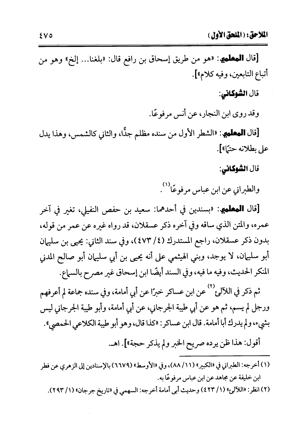 [قال المعلمي: "بسندين في أحدهما: سعيد بن حفص النفيلي، تغير في آخر عمره، والمتن الذي ساقه وفي آخره ذكر عسقلان، قد رواه غيره عن عمر من قوله، بدون ذكر عسقلان، راجع المستدرك (4/ 473)، وفي سند الثاني: يحيى بن سليمان أبو سليمان، لا يوجد، وبني الهيثمي على أنه يحيى بن أبي سليمان أبو صالح المدني المنكر الحديث، وفيه ما فيه، وفي السند أيضًا ابن إسحاق غير مصرح بالسماع.