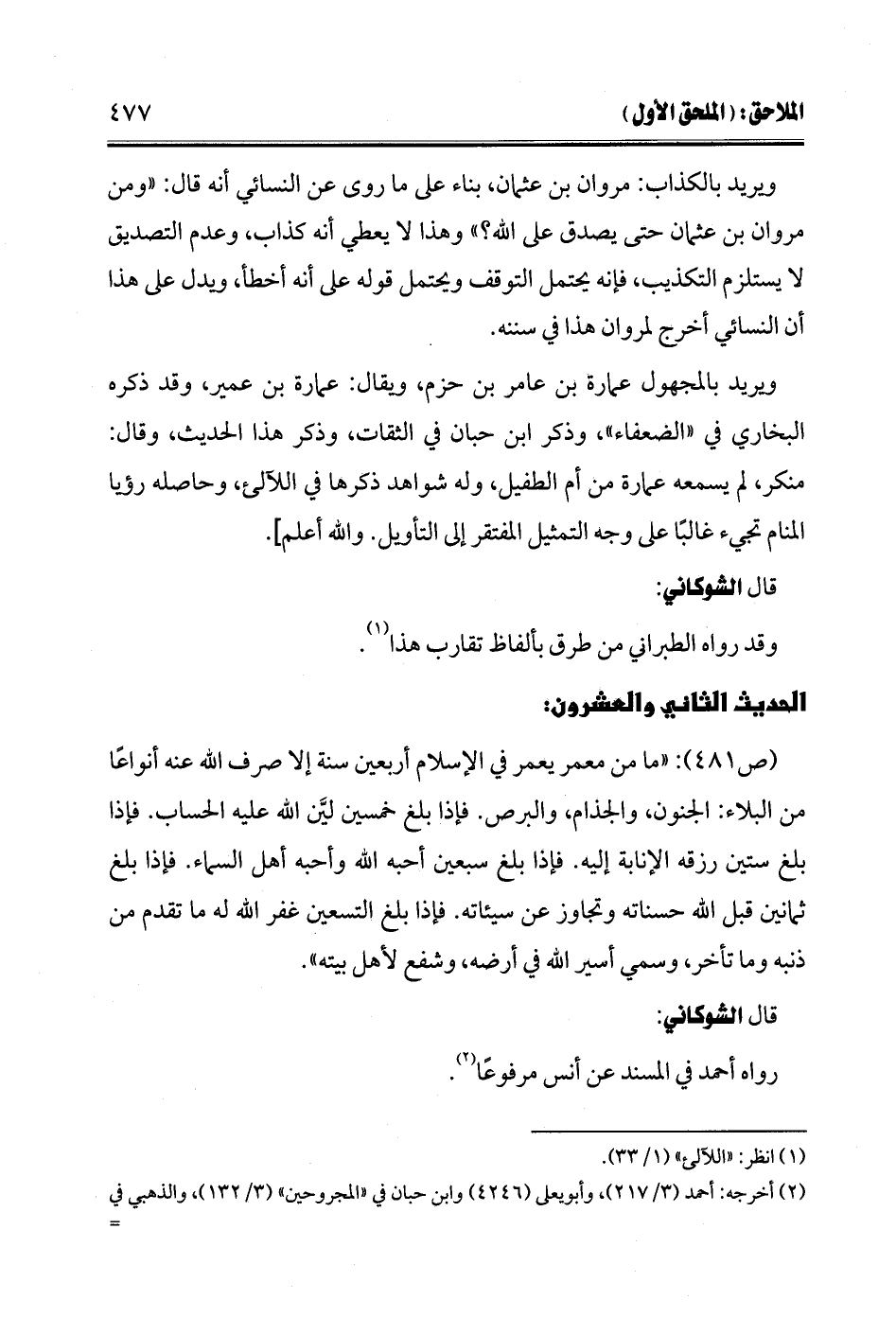 (ص 481): "ما من معمر يعمر في الإسلام أربعين سنة إلا صرف الله عنه أنواعًا من البلاء: الجنون، والجذام، والبرص. فإذا بلغ خمسين ليَّن الله عليه الحساب. فإذا بلغ ستين رزقه الإنابة إليه. فإذا بلغ سبعين أحبه الله وأحبه أهل السماء. فإذا بلغ ثمانين قبل الله حسناته وتجاوز عن سيئاته. فإذا بلغ التسعن غفر الله له ما تقدم من ذنبه وما تأخر، وسمي أسير الله في أرضه، وشفع لأهل بيته".