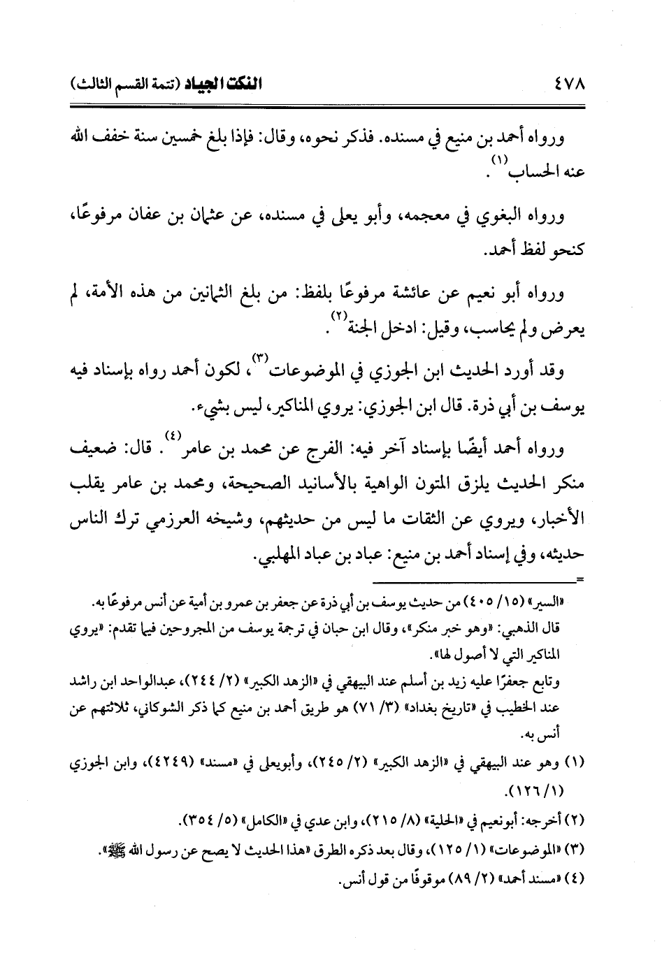 ورواه أبو نعيم عن عائشة مرفوعًا بلفظ: من بلغ الثمانين من هذه الأمة، لم يعرض ولم يحاسب، وقيل: ادخل الجنة (¬2).