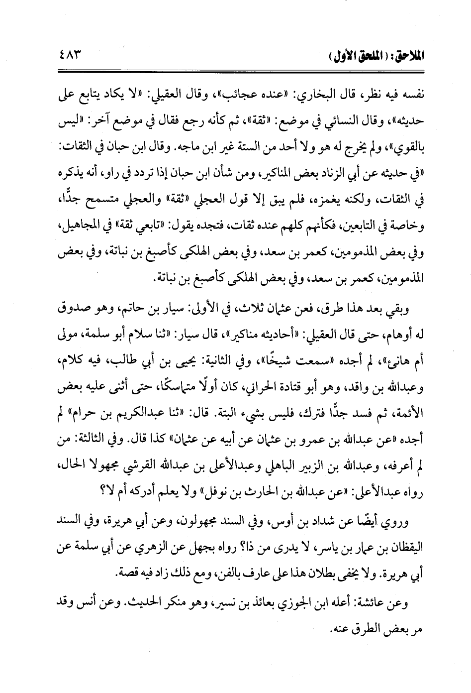نفسه فيه نظر، قال البخاري: "عنده عجائب"، وقال العقيلي: "لا يكاد يتابع على حديثه"، وقال النسائي في موضع: "ثقة"، ثم كأنه رجع فقال في موضع آخر: "ليس بالقوي"، ولم يخرج له هو ولا أحد من الستة غير ابن ماجه. وقال ابن حبان في الثقات: "في حديثه عن أبي الزناد بعض المناكير، ومن شأن ابن حبان إذا تردد في راو، أنه يذكره في الثقات، ولكنه يغمزه، فلم يبق إلا قول العجلي "ثقة" والعجلي متسمح جدًّا، وخاصة في التابعين، فكأنهم كلهم عنده ثقات، فتجده يقول: "تابعي ثقة" في المجاهيل، وفي بعض المذمومين، كعمر بن سعد، وفي بعض الهلكى كأصبغ بن نباتة، وفي بعض المذمومن، كعمر بن سعد، وفي بعض الهلكى كأصبغ بن نباتة.
