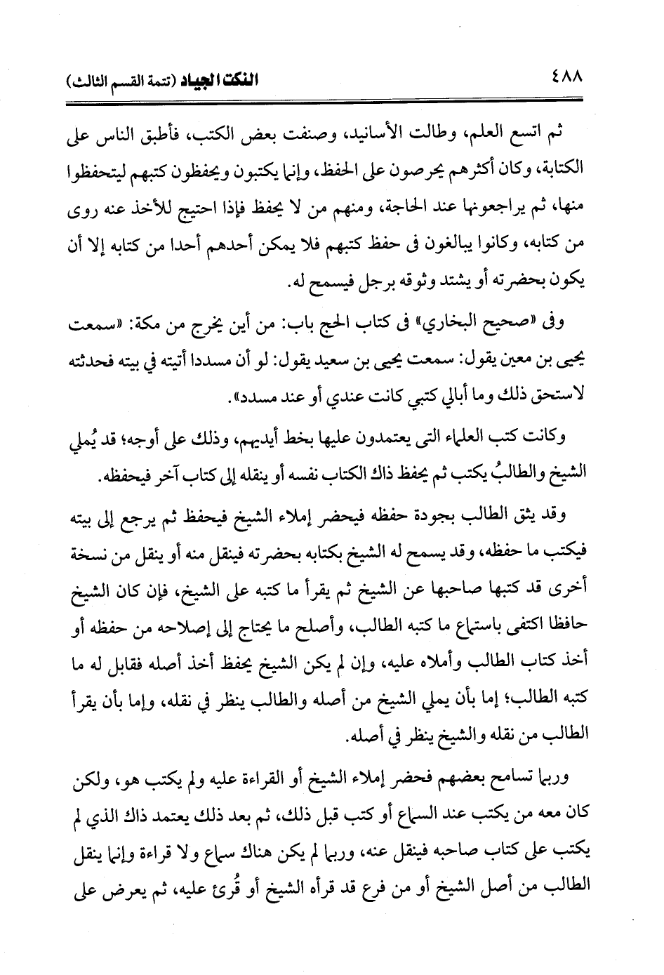 ثم اتسع العلم، وطالت الأسانيد، وصنفت بعض الكتب، فأطبق الناس على الكتابة وكان أكثرهم يحرصون على الحفظ، وإنما يكتبون ويحفظون كتبهم ليتحفظوا منها، ثم يراجعونها عند الحاجة، ومنهم من لا يحفظ فإذا احتيج للأخذ عنه روى من كتابه، وكانوا يبالغون في حفظ كتبهم فلا يمكن أحدهم أحدًا من كتابه إلا أن يكون بحضرته أو يشتد وثوقه برجل فيسمح له.