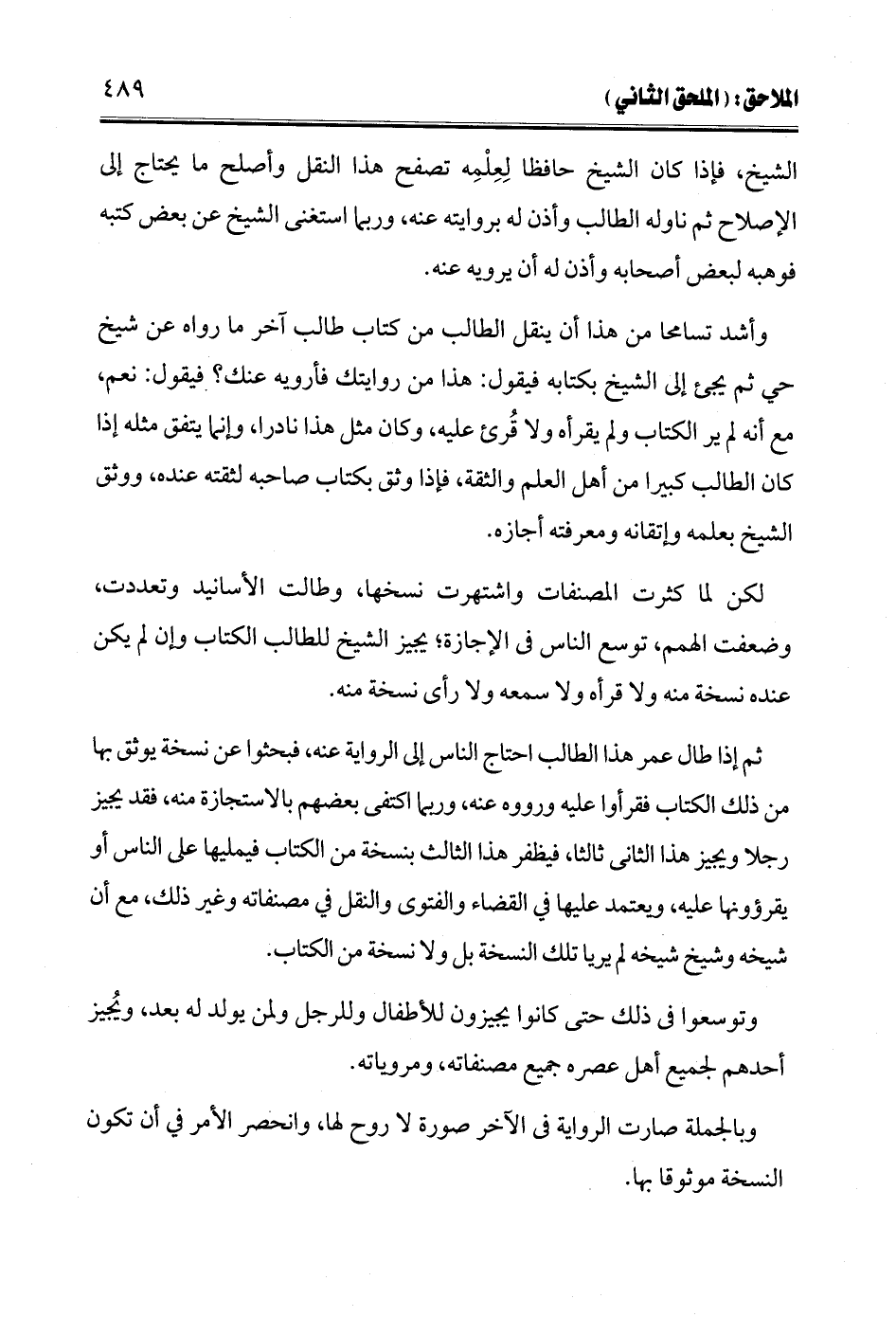 ثم إذا طال عمر هذا الطالب احتاج الناس بلى الرواية عنه، فبحثوا عن نسخة يوثق بها من ذلك الكتاب فقرأوا عليه ورووه عنه، وربما اكتفى بعضهم بالاستجازة منه، فقد يجيز رجلا ويجيز هذا الثاني ثالثًا، فيظفر هذا الثالث بنسخة من الكتاب فيمليها على الناس أو يقرؤونها عليه، ويعتمد عليها في القضاء والفتوى والنقل في مصنفاته وغير ذلك، مع أن شيخه وشيخ شيخه لم يريا تلك النسخة بل ولا نسخة من الكتاب.